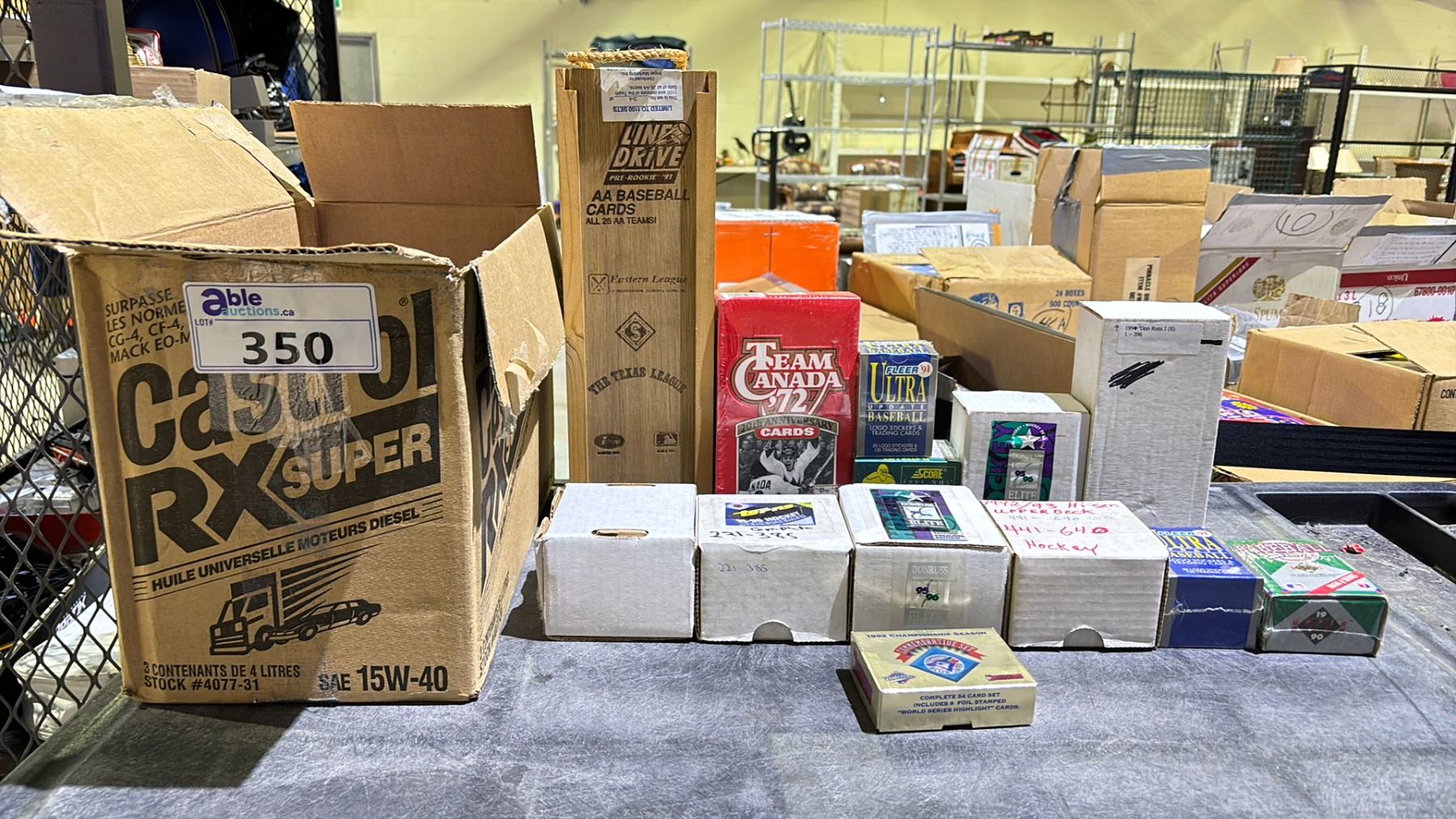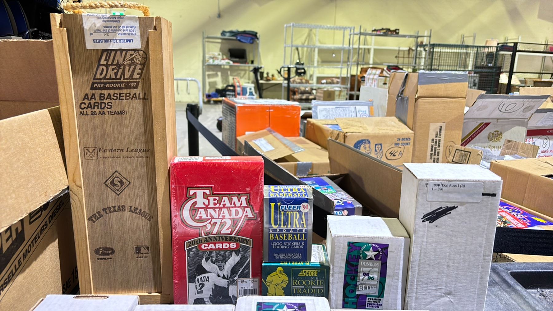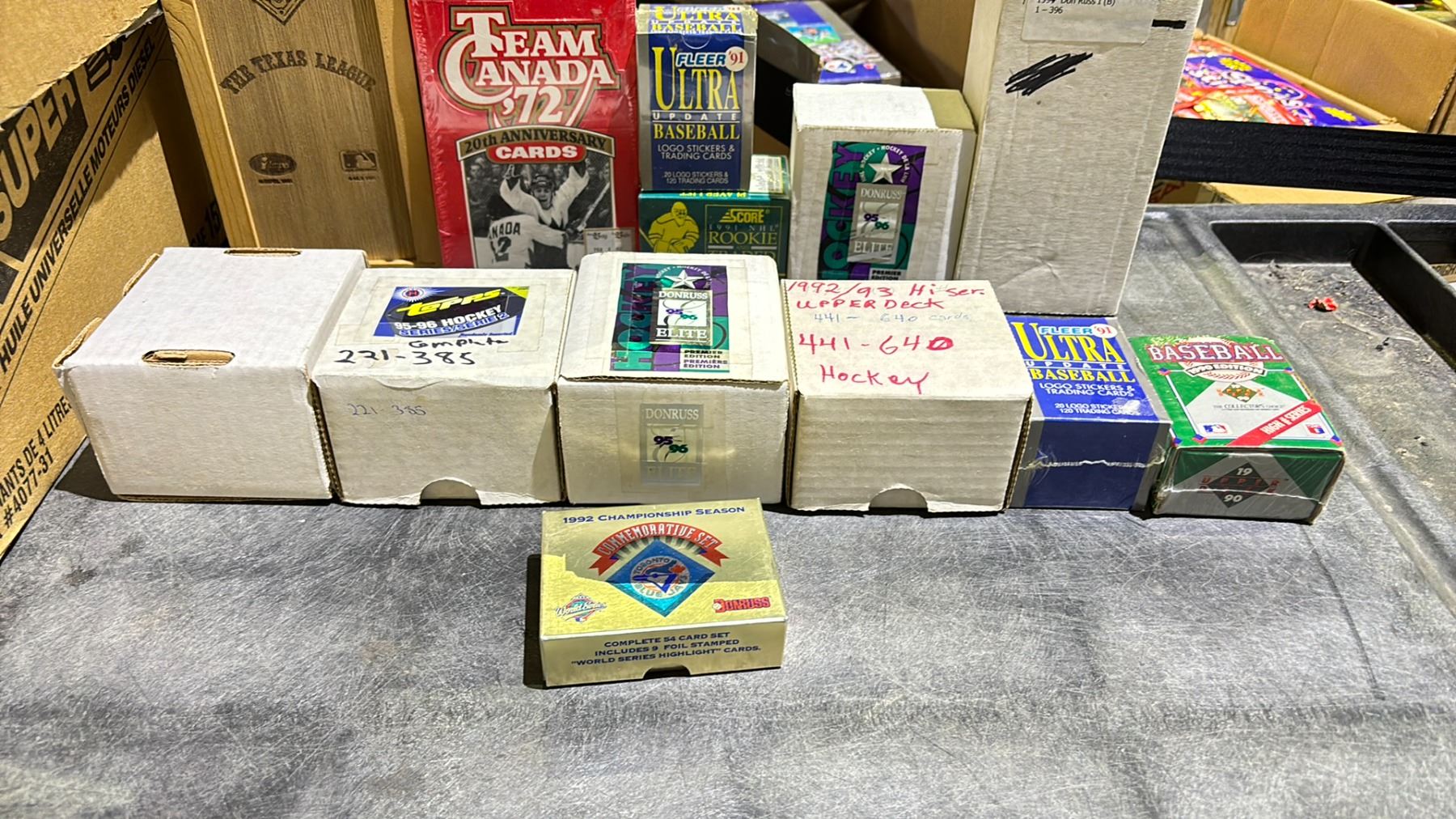 1 1989 UPPER DECK BASEBALL SET, KEN GRIFFEY JR. ROOKIE 1-800 CARDS (COMPLETE), 1 1990 O-PEE-CHEE HOCKEY SET, 330 CARDS (COMPLETE), 1 1990 SCORE HOCKEY, CANADIAN, 1-440 CARDS (COMPLETE), 2 1992 DONRUSS TORONTO BLUE JAYS SETS, 54 CARDS PER SET (COMPLETE), 1 1991 AA BASEBALL, LINE DRIVE PRE-ROOKIE, ALL 26 TEAM CARDS, 34/1100, 2 1995-1996 DONRUSS ELITE HOCKEY PREMIER EDITON SET, 1-109 SET (FACTORY SEALED), 2 1995-1996 TOPPS, SERIES 2 SET, 221-385 CARDS (COMPLETE), 1 1993 DONRUSS BASEBALL SET, 1-396 CARDS (COMPLETE) 1 1992-1993 UPPER DECK HIGH SERIES HOCKEY CARDS, 441-640 CARDS 1 1991 NHL ROOCKIE & TRADED HOCKEY SET, 110 CARDS (FACTORY SEALED) 1 TEAM CANADA 72 FUTURE TRENDS BOX, 24 PACKS (FACTORY SEALED) 2 1991 FLEER ULTRA UPDATE BASEBALL CARDS, 120 PLUS 20 (FACTORY SEALED) 1 1990 UPPER DECK BASEBALL HIGH SERIES SET, 701-800 CARDS (FACTORY SEALED)