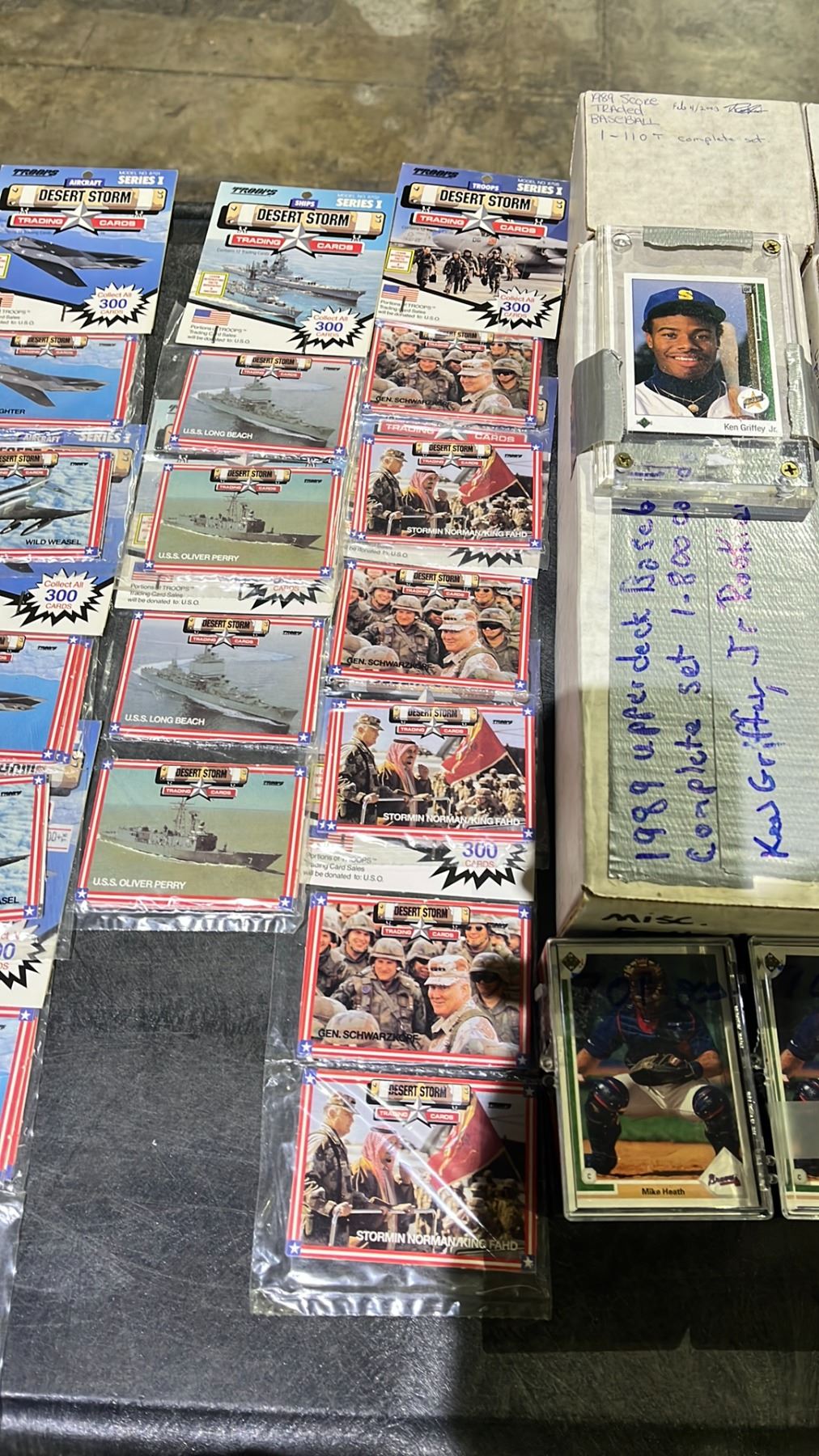 1 1989 UPPERDECK BASEBALL SET, KEN GRIFFEY JR. ROOKIE, 1-800 (COMPLETE) 1 1993 SCORE BASEBALL SET, DEREK JETER ROOKIE , 1-660 CARDS (COMPLETE) 1 1989 SCORE BASEBALL TRADED SET, 1T- 110T (COMPLETE) 2 1989-1990 O-PEE-CHEE HOCKEY SETS, 1-528 CARDS, (COMPLETE) 3 1989 TOPPS BASEBALL DEBUT SETS, 1-150 CARDS (COMPLETE) 3 1991 UPPER DECK BASEBALL SETS, 701-800 CARDS (COMPLETE) 1 1989 SCORE BASEBALL TRADED SET, 1T-110T (COMPLETE) 1 1991 DESERT STORM TRADING CARDS, SERIES 1, 1 BOX, 20 PACKS 1 1991-1992 UPPERDECK HOCKEY LOW SET, 1-500 (COMPLETE) 1 1991-1992 PARKHURST HOCKEY CARDS, HIGH SERIES, 226-450 (COMPLETE) 1 1991-1992 PARKHURST HOCKEY CARDS, LOW SERIES 1-225 CARDS (COMPLETE)