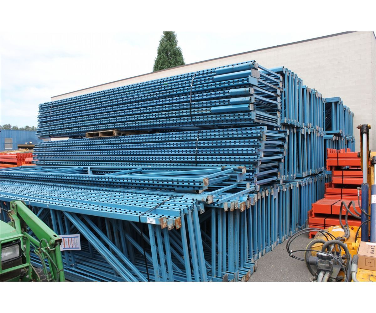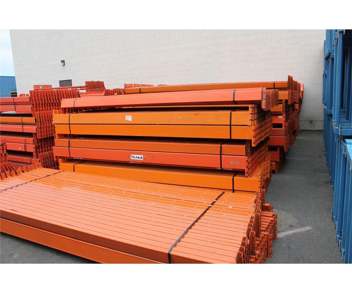 1- 21' BLUE HEAVY DUTY PALLET RACKING UPRIGHT WITH 6- 11' X 6.5  5000 LB CAPACITY ORANGE CROSSBARS