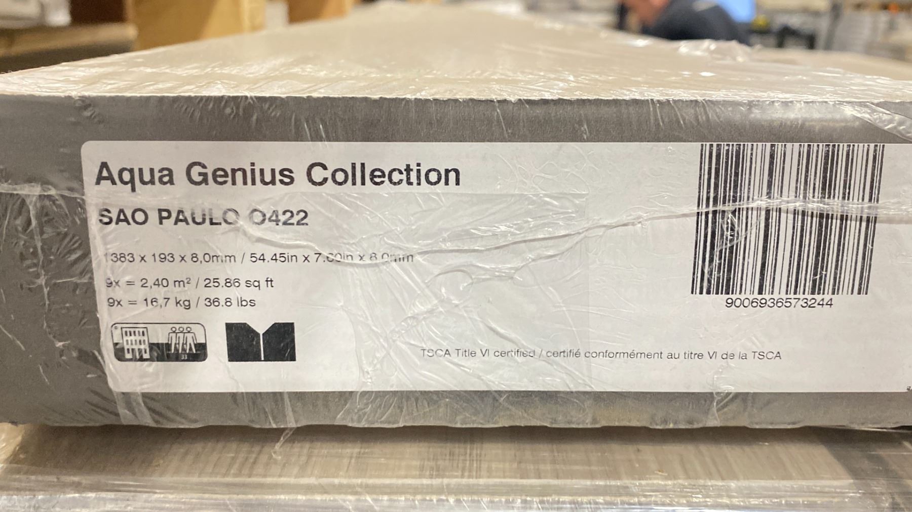 1,344.72 SQ FT OF EURO ORIGINAL AQUA GENIUS COLLECTION 8MM SAO PAULO 0422 GLUELESS LAMINATE FLOORING 25.86 SQ FT PER BOX 52 BOXES 1,344.72 SQ FT TOTAL *MUST TAKE ALL ON PALLET*