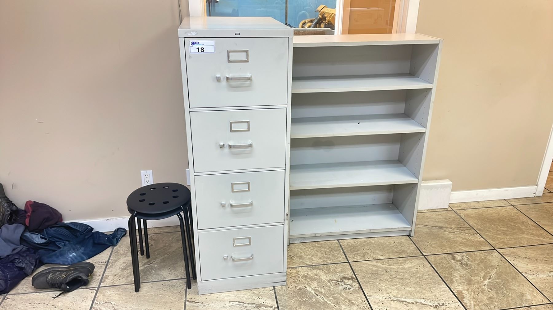 1- 4 DRAWER OFFICE FILING CABINET AND 4 SHELF BOOK SHELF
