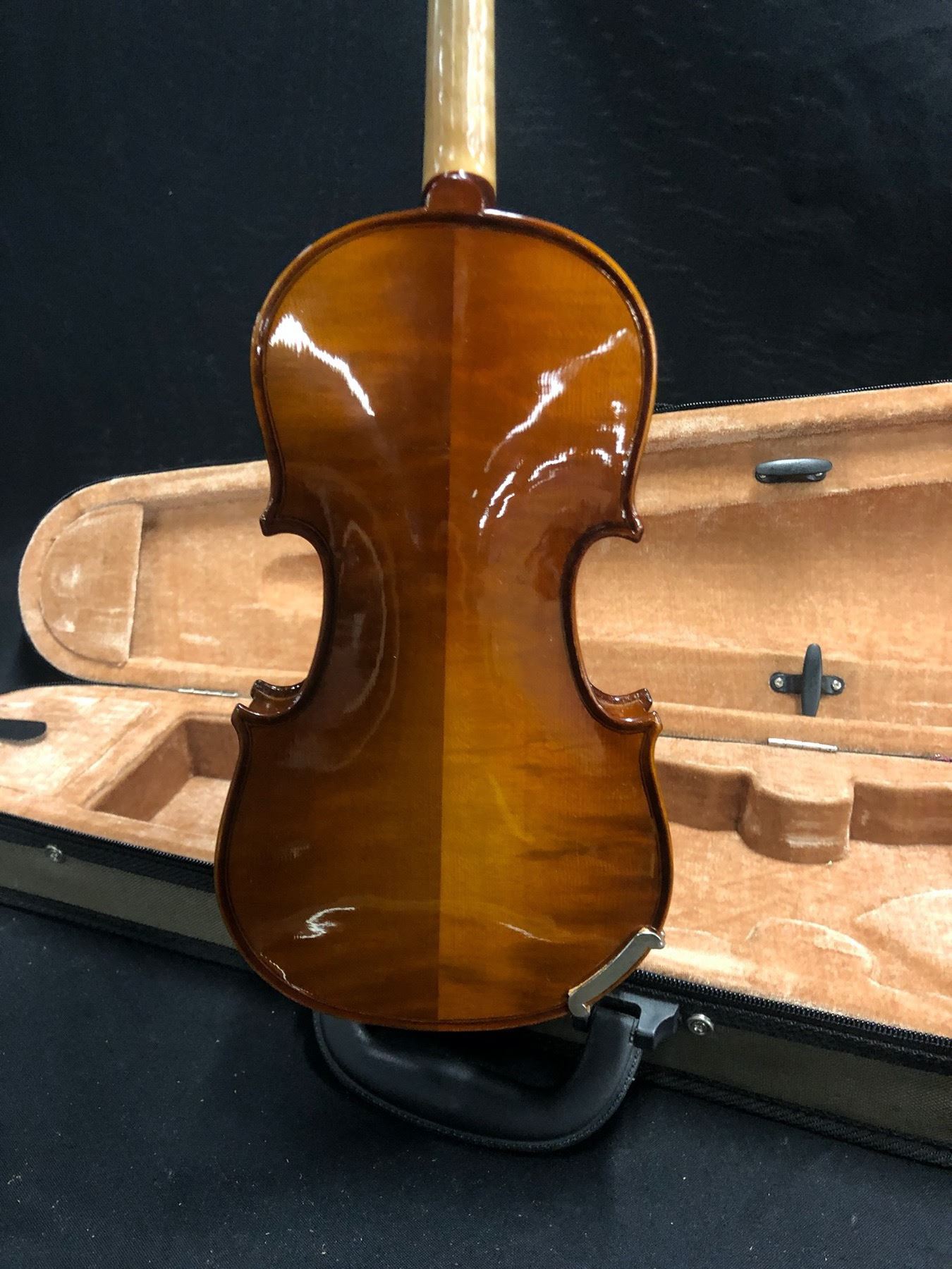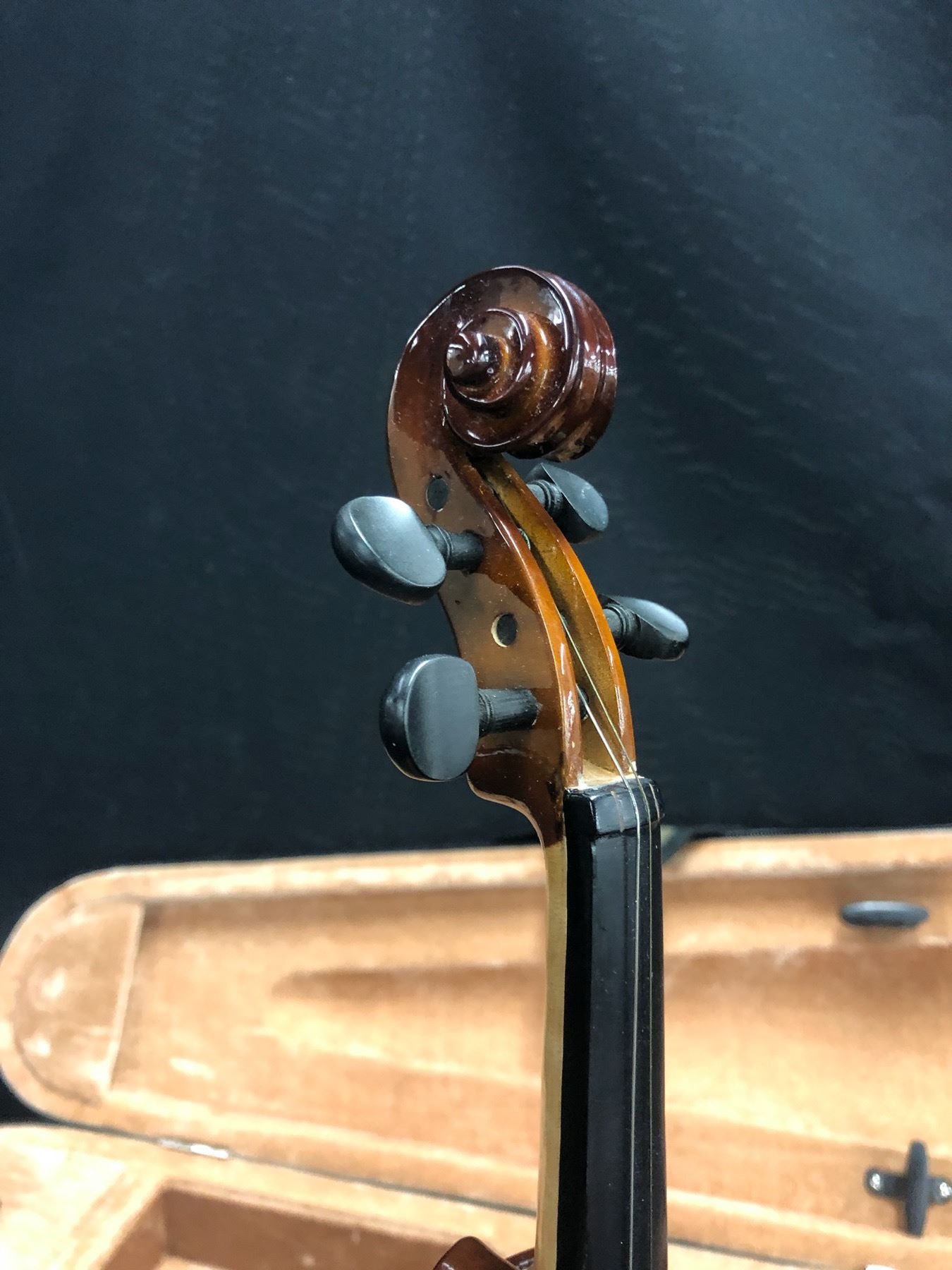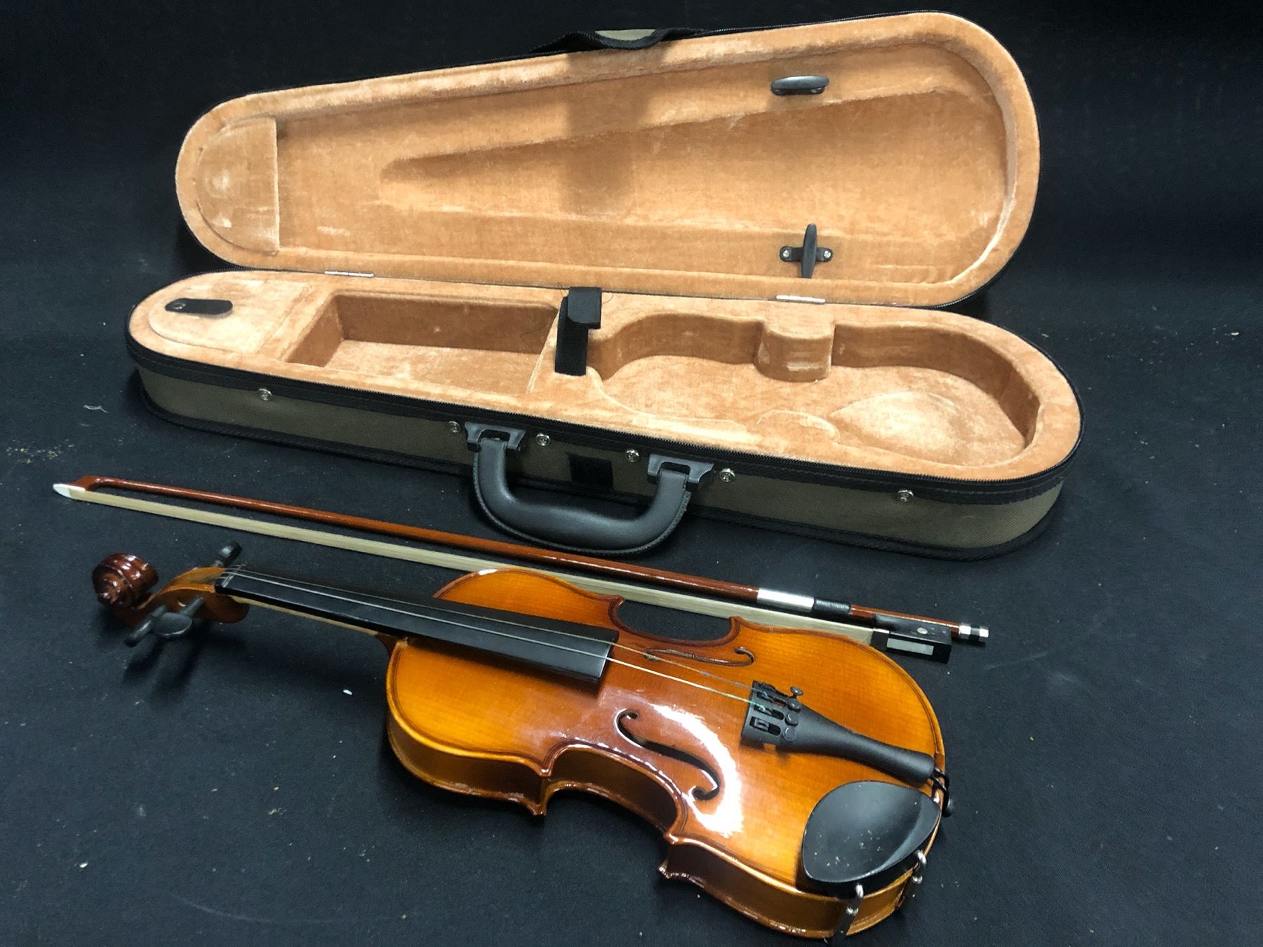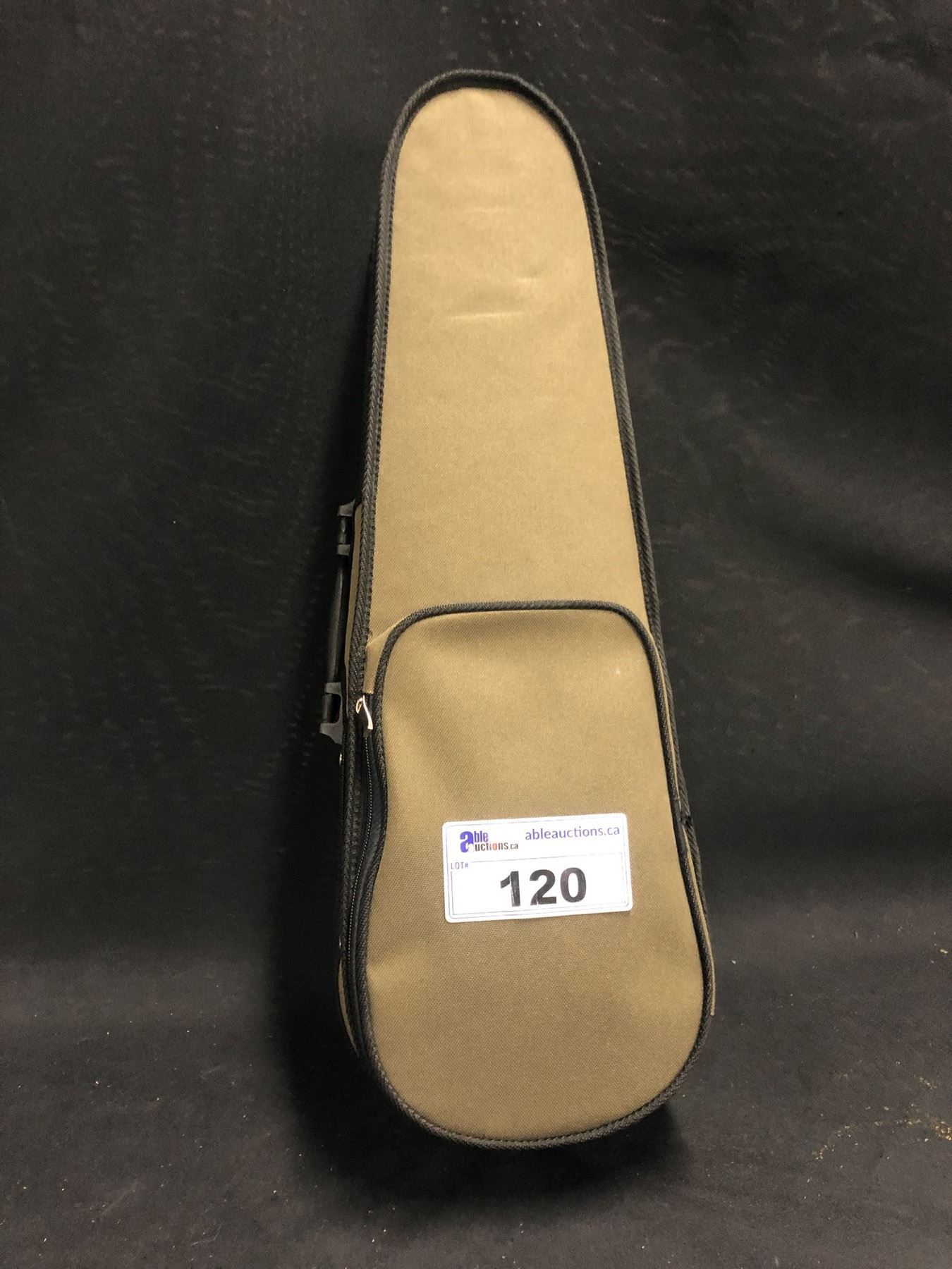 1/8 SIZE VIOLIN, MISSING BRIDGE, COMES WITH BOW AND SOFT SHELL CASE, CASE MISSING ZIPPER