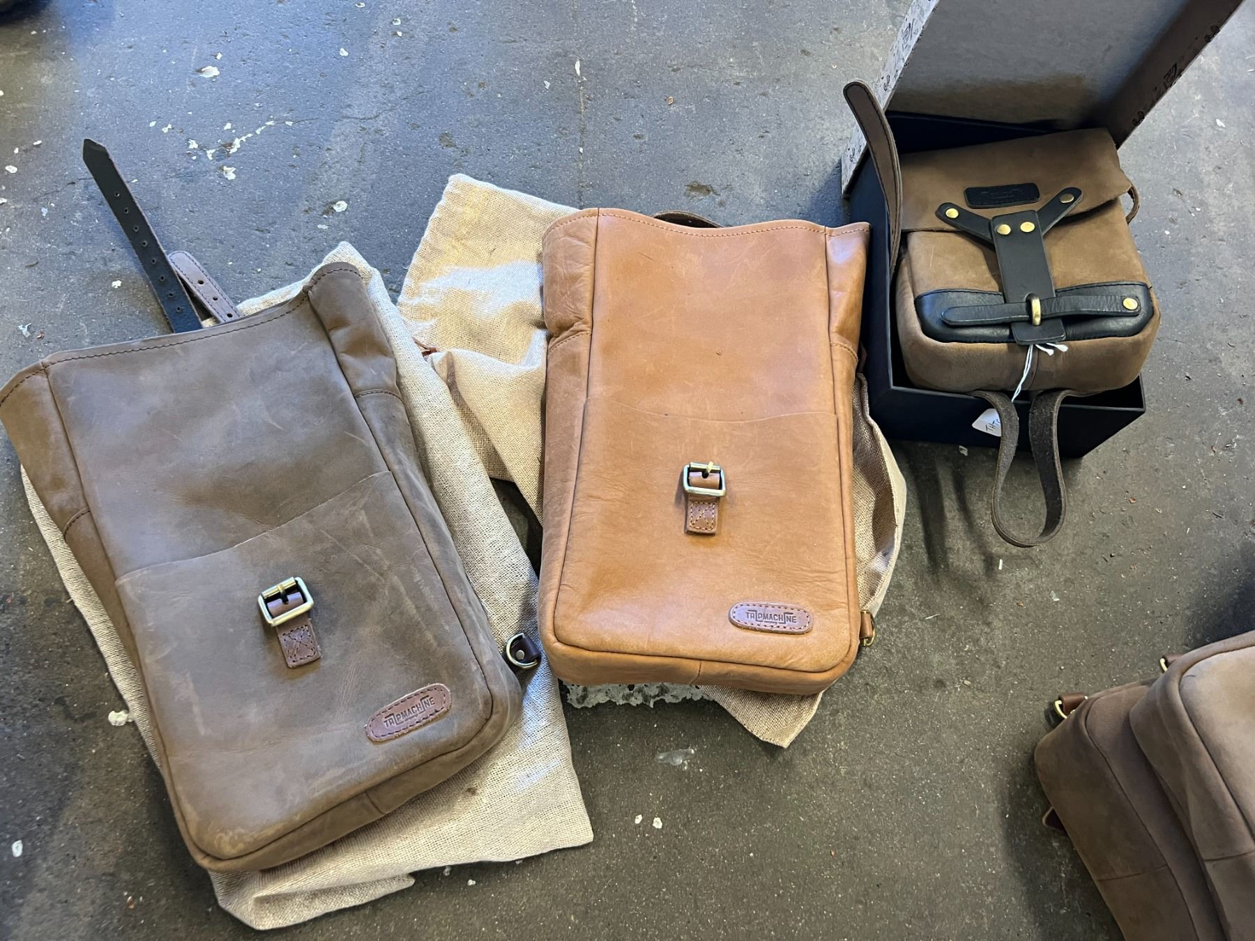 1 BROWN LEATHER THIGH BAG, 1 BROWN LEATHER MINI PANNIER, 1 TAN MINI PANNIER