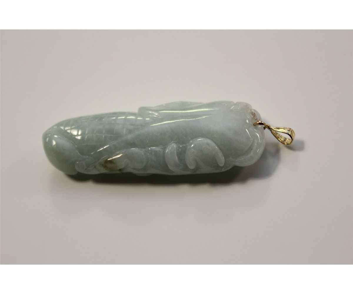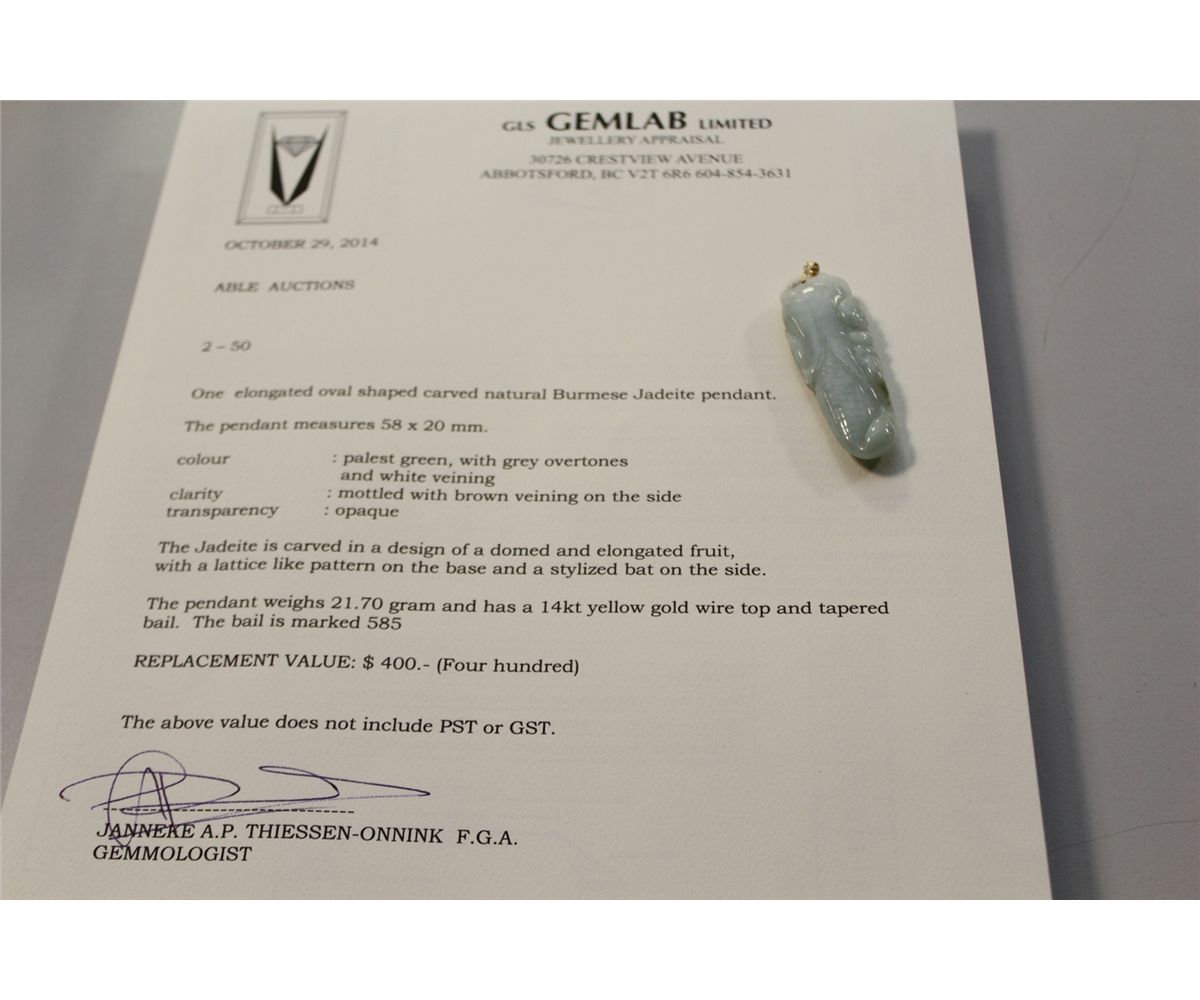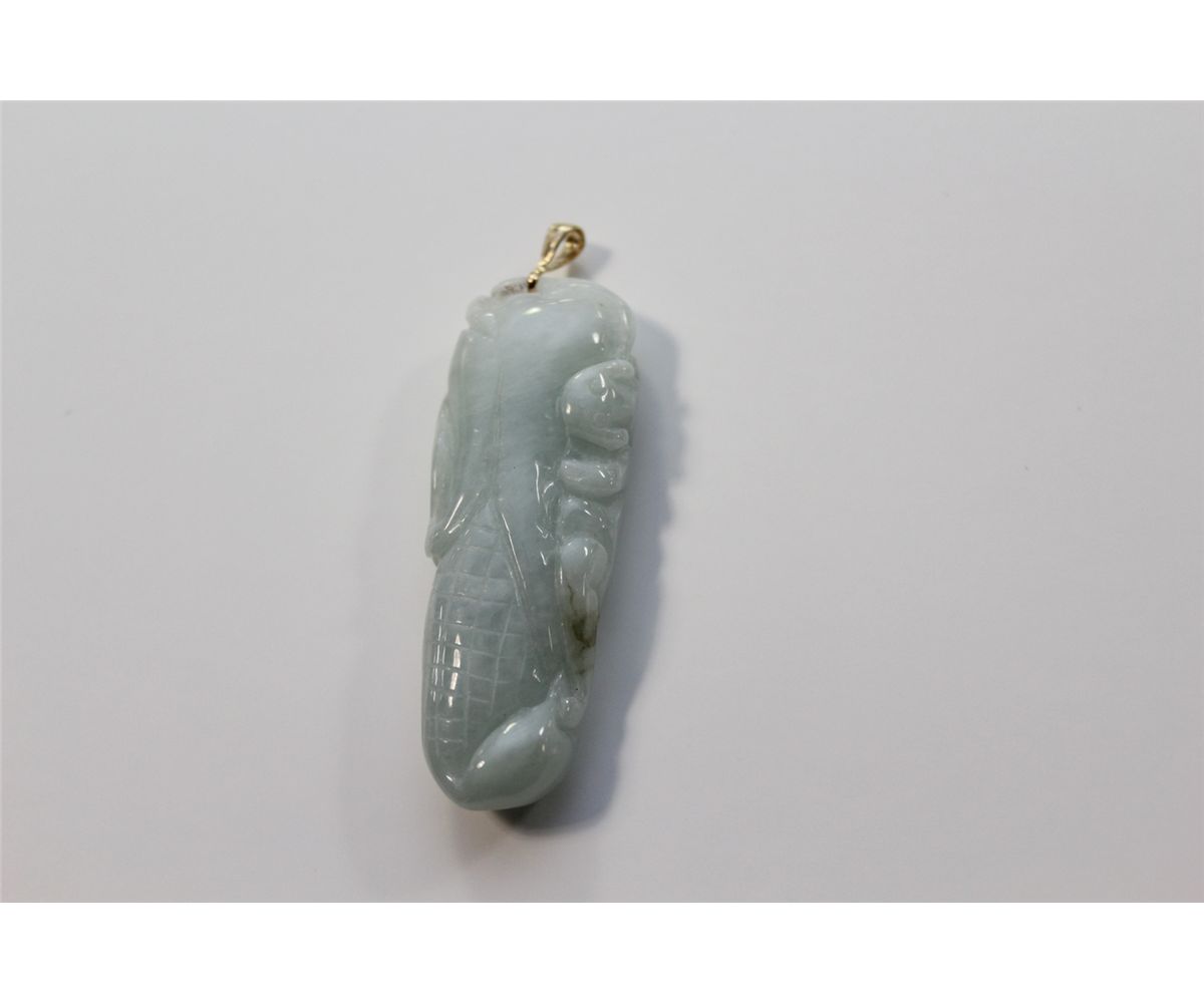 1 ELONGATED OVAL SHAPED CARVED NATURAL BURMESE JADEITE PENDANT CARVED IN THE SHAPE OF A DOMED AND ELONGATED FRUIT WITH A LATTICE LIKE PATTERN ON BASE AND A STYLISED BAT ON SIDE. REPLACEMENT VALUE: $400.00