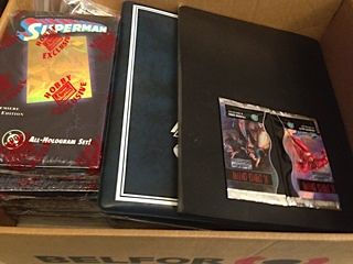 1 FACTORY SEALED CASE DC COSMIC TEAMS PLUS 8 SEALED BOXES, 2 SEALED BOXES SUPERMAN HOLOGRAMS, 1 BOX DOOMSDAY DEATH OF SUPERMAN CARDS PLUS ASSORTED BINDERS, SETS & BLOODLINES
