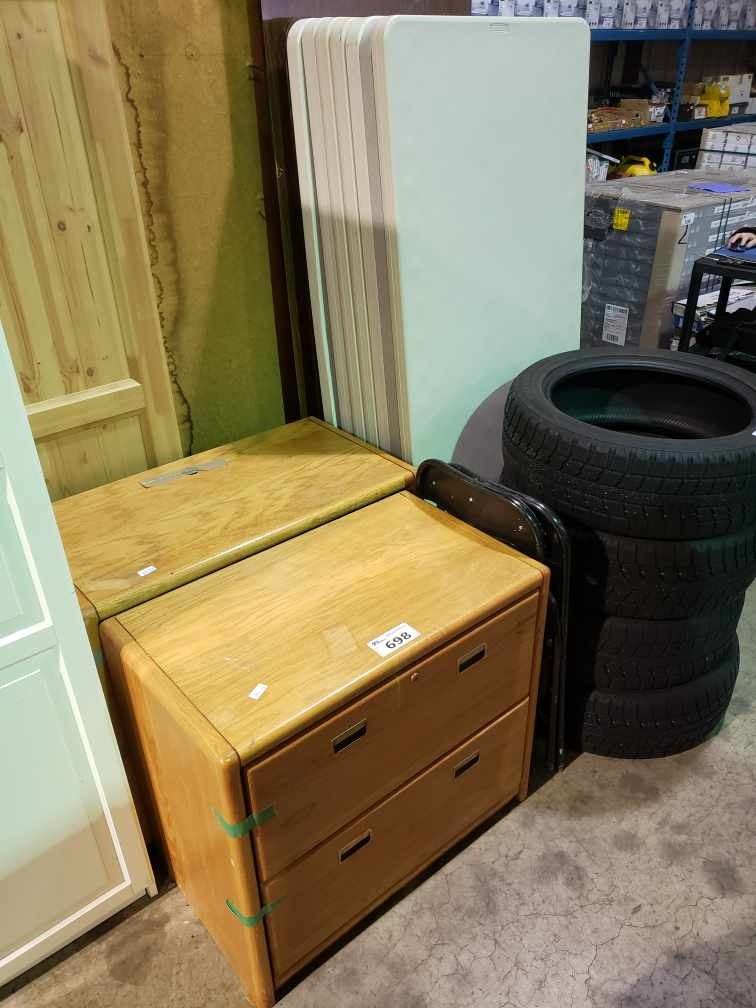 1 LIGHT WOOD 2 DRAWER LATERAL FILING CABINET, 1 LIGHT WOOD 3 TIER SLIDING SHELF STORAGE CABINET AND 8 ASSORTED FOLDING TABLES WITH 2 FOLDING CHAIRS