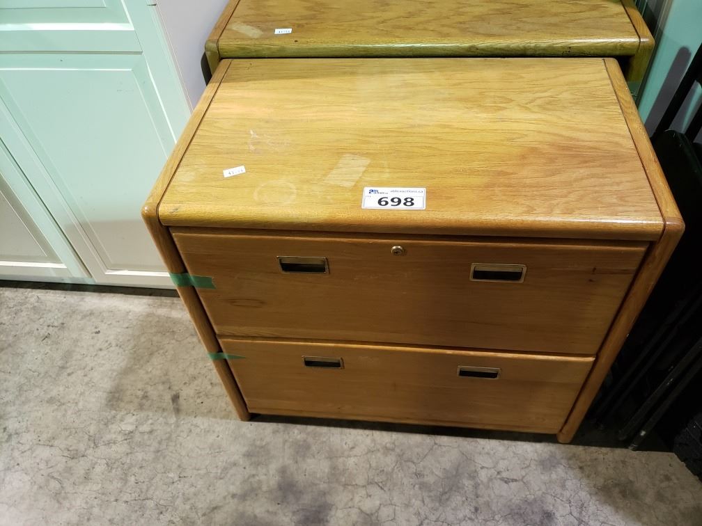 1 LIGHT WOOD 2 DRAWER LATERAL FILING CABINET, 1 LIGHT WOOD 3 TIER SLIDING SHELF STORAGE CABINET