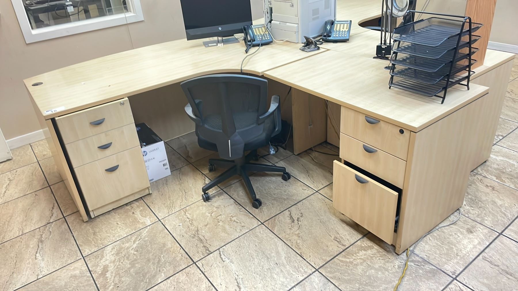 1 MAPLE PEDESTAL L SHAPED OFFICE DESK WITH 6 DRAWERS AND 1 MESH ROLLING OFFICE CHAIR *OFFICE COMPUTER NOT INCLUDED *