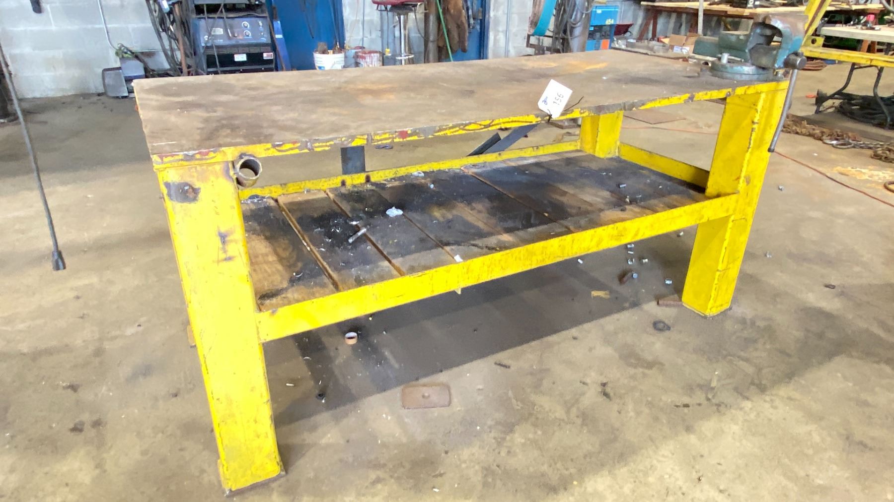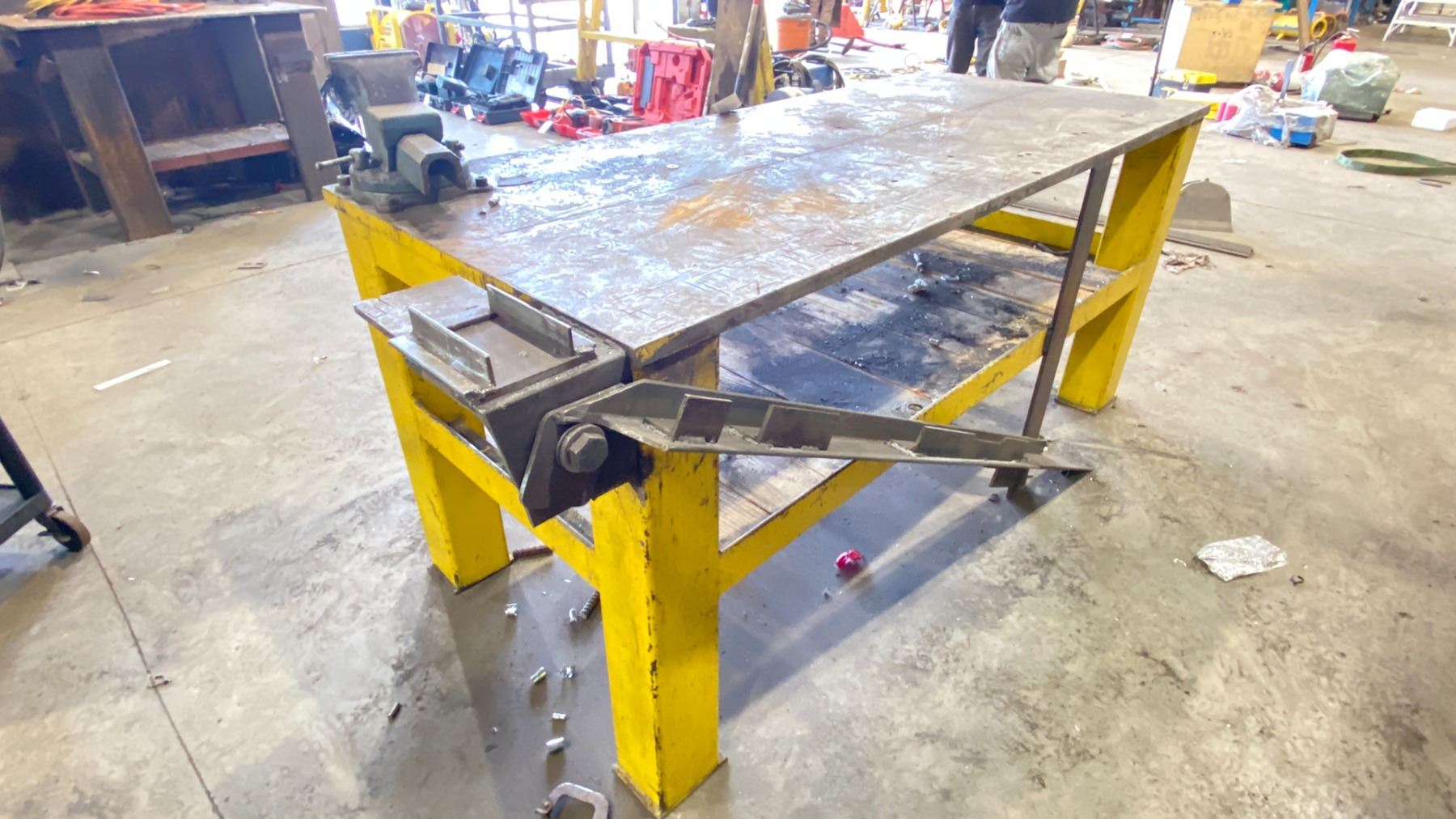 1" METAL TOP WELDERS TABLE WITH MOUNTED MECHANICS VICE TABLE APPROX 6'L X 2.8'W X 2.8'H
