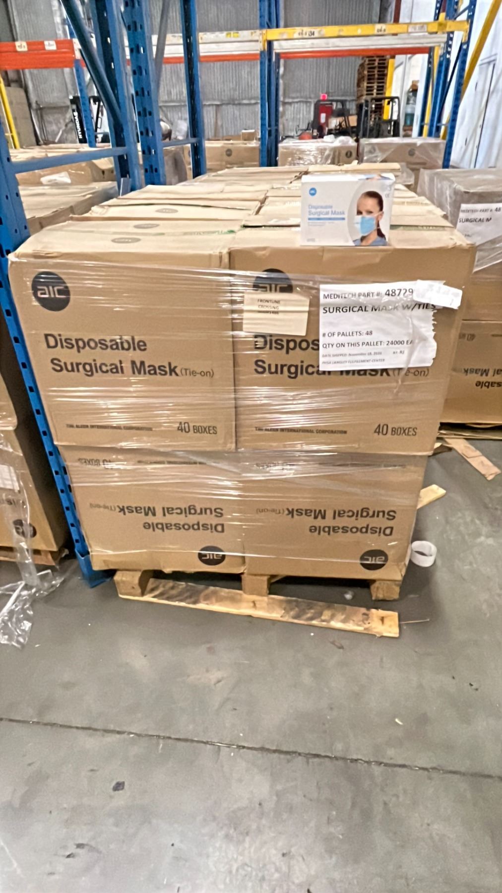 1 PALLET OF AIC DISPOSABLE SURGICAL MASKS (TIE-ON) - 12 BOXES PER PALLET/2000 PCS.PER BOX