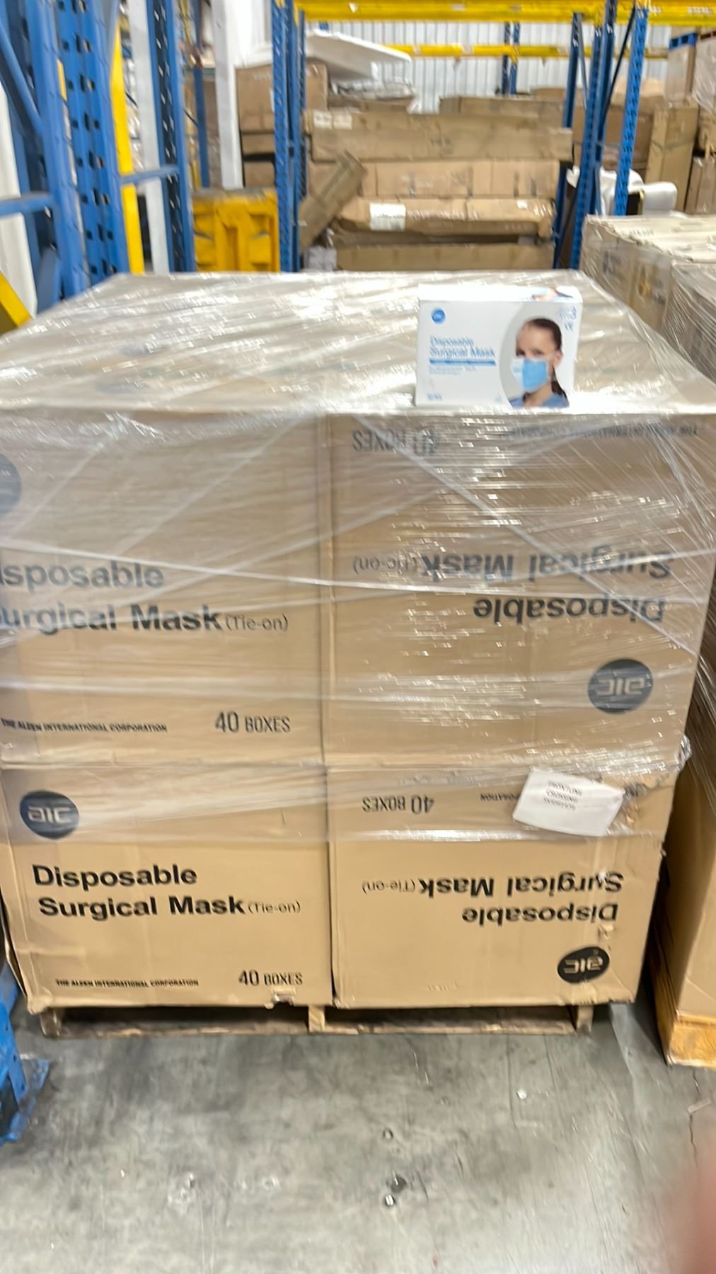 1 PALLET OF AIC DISPOSABLE SURGICAL MASKS (TIE-ON) - 12 BOXES PER PALLET/2000 PCS.PER BOX