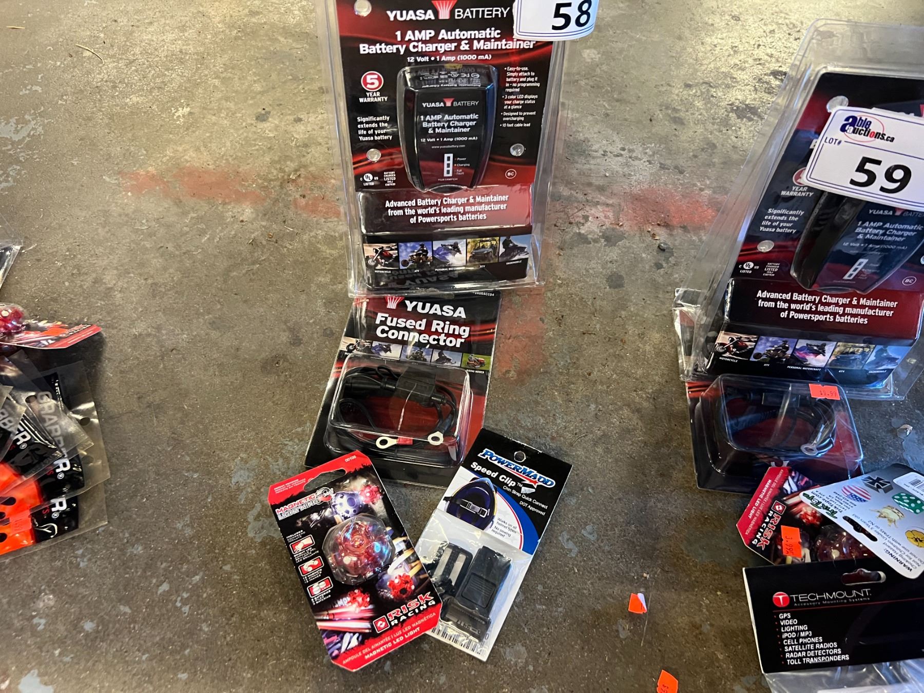 1 YUASA BATTERY MAINTAINER, 1 YUASA FUSED RING CONNECTOR, 1 MAGNETIC LIGHT MINE, 1 SPEED CLIP QUICK CONNECT FOR HELMET