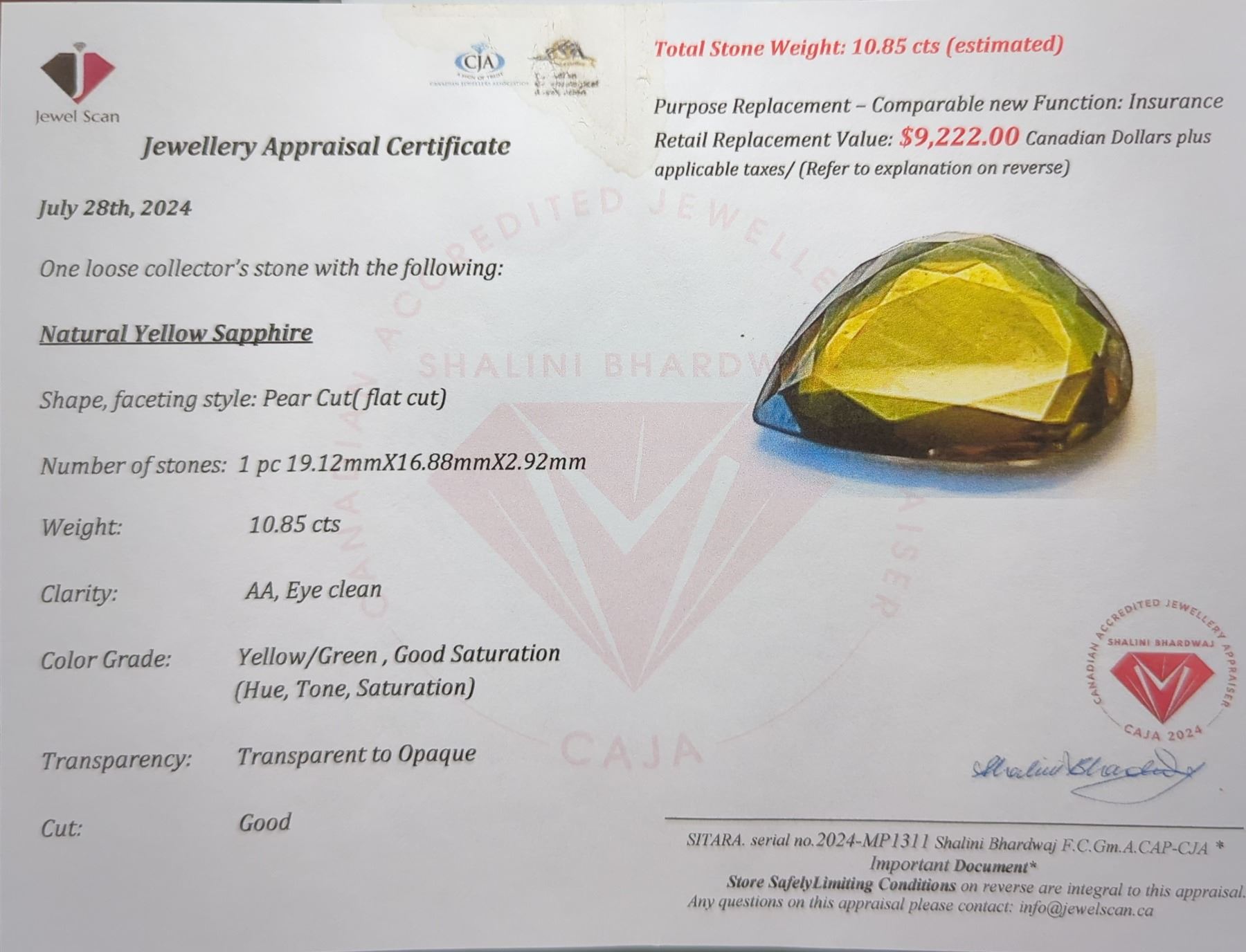 10.85 CT CERTIFIED YELLOW SAPPHIRE GEMSTONE ($9,222 APPRAISAL) - **APPRAISAL NOT GUARANTEED**