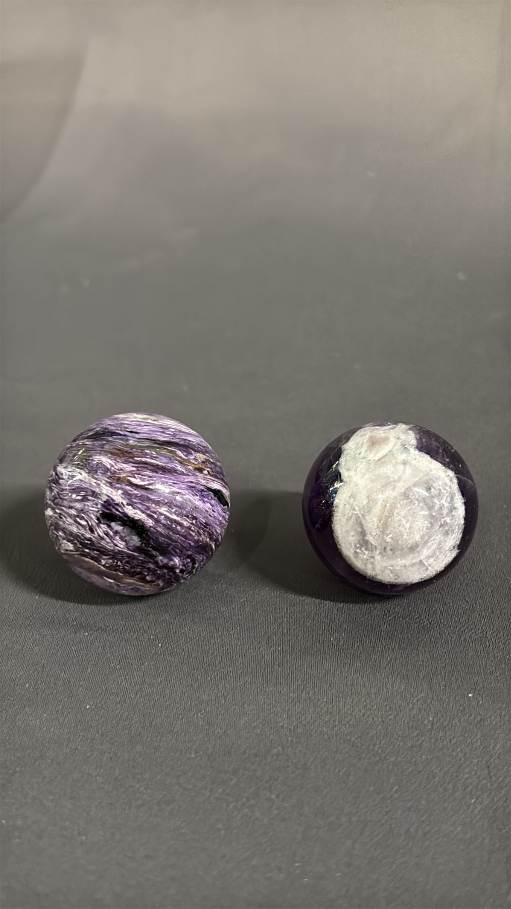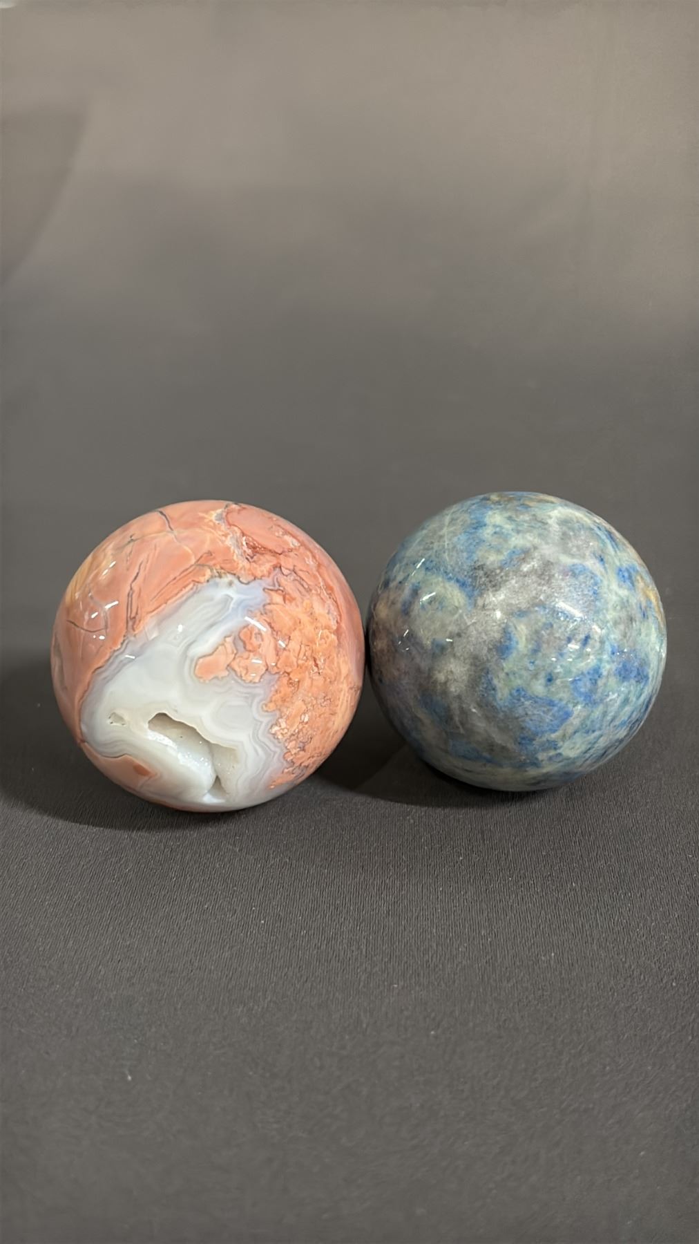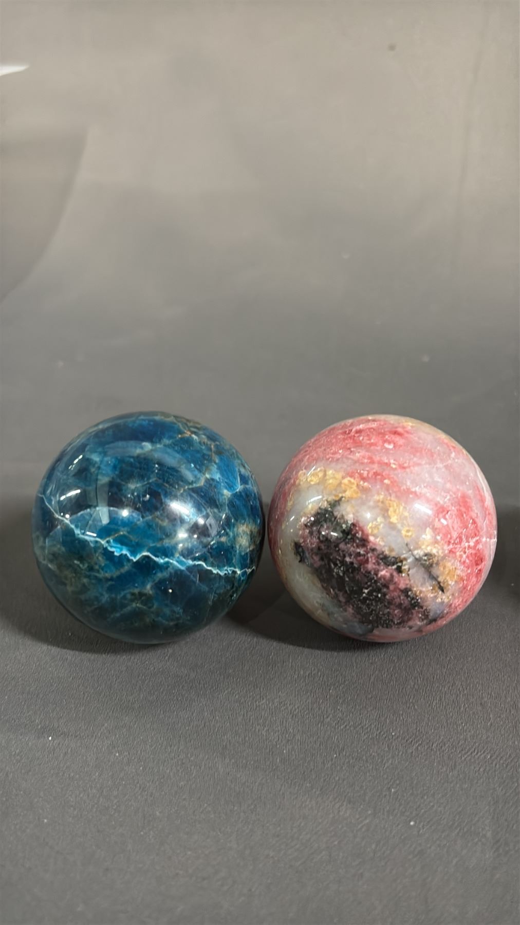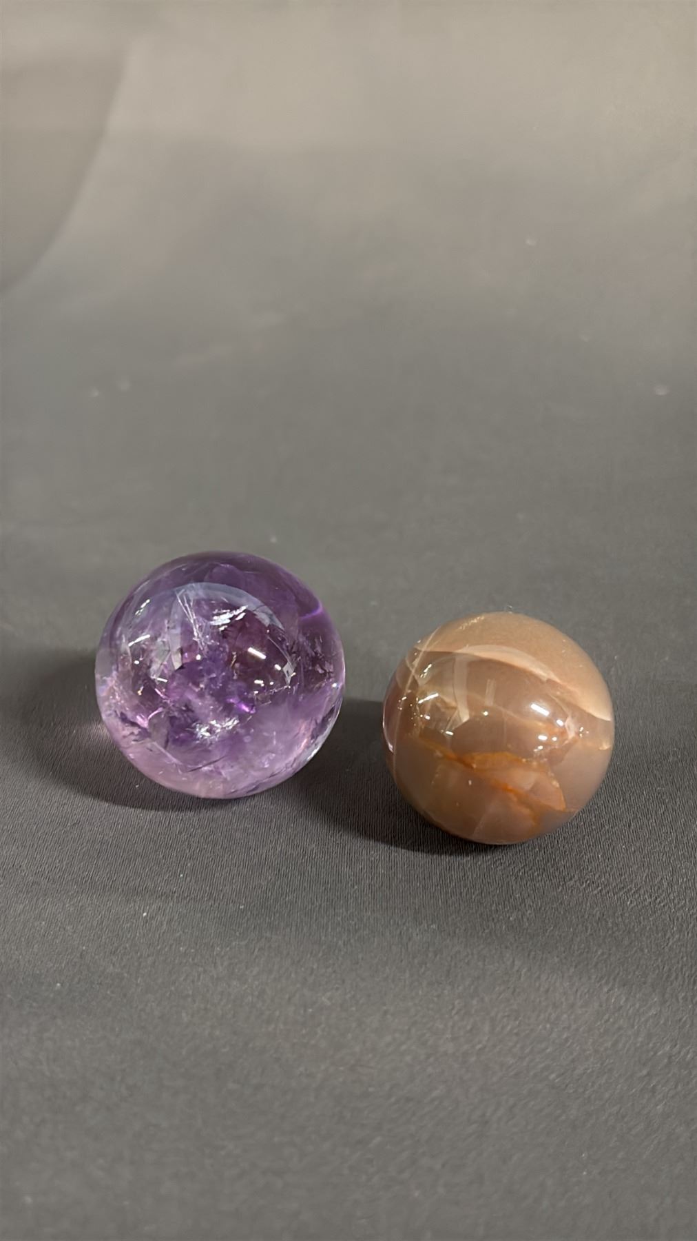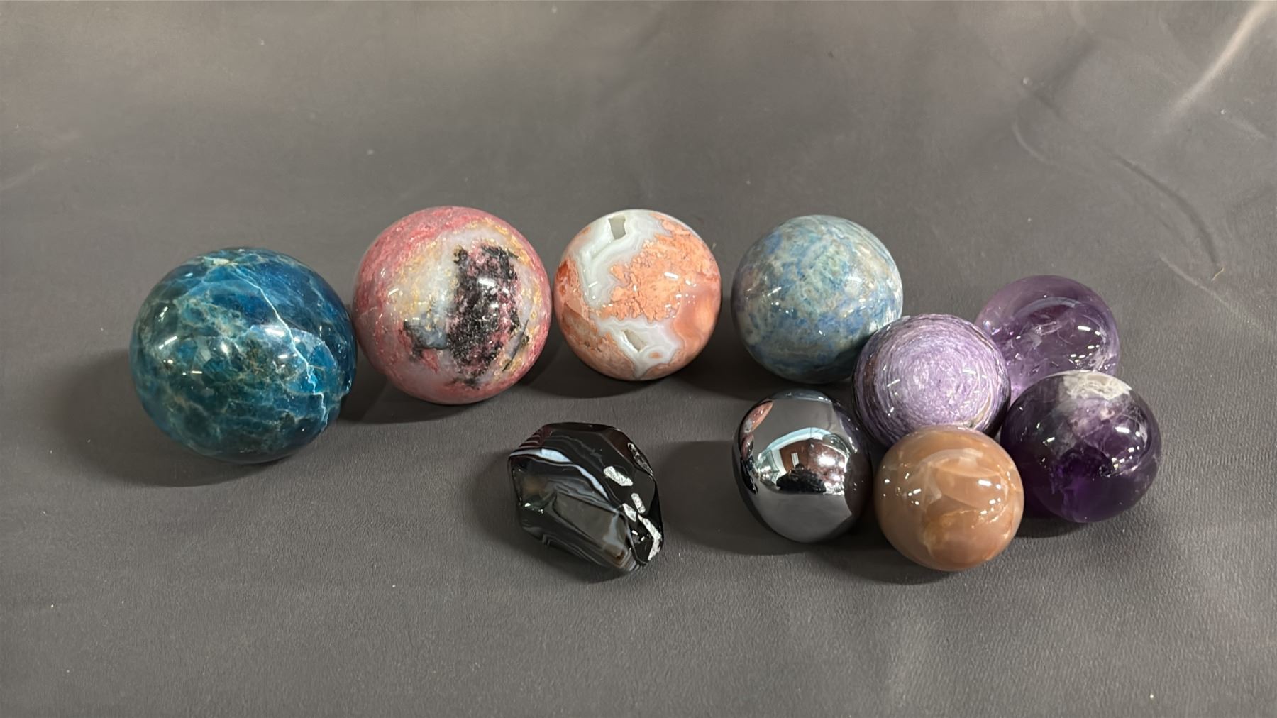 (10) ASSORTED AMETHYST, BLUE APATITE, RHODONITE & AGATE SPHERES & CARVED SHAPES