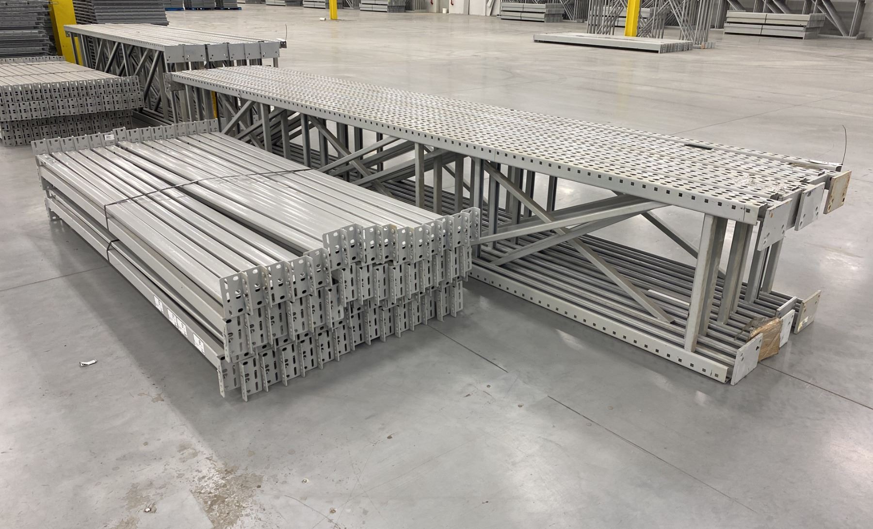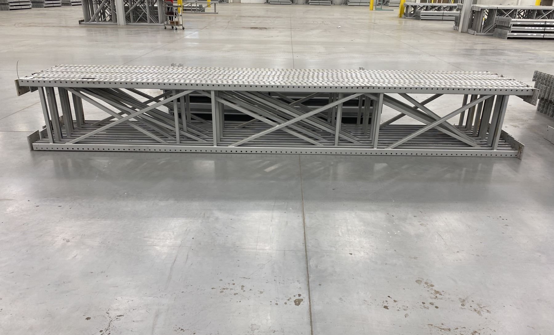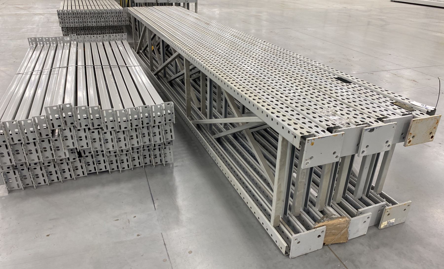 10 BAYS GREY INDUSTRIAL PALLET RACKING (11) UPRIGHTS 192" X 28" AND (60) SIDE BEAMS 102" X 2.5", WITH 8" X 6" WELDED FOOTPLATES 1/2" THICK