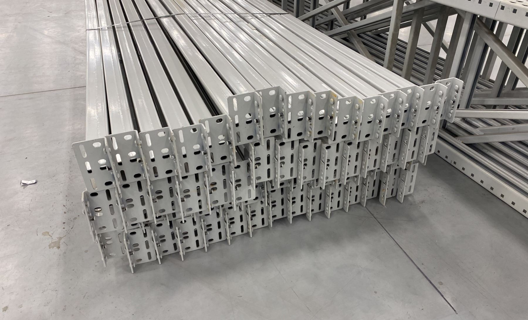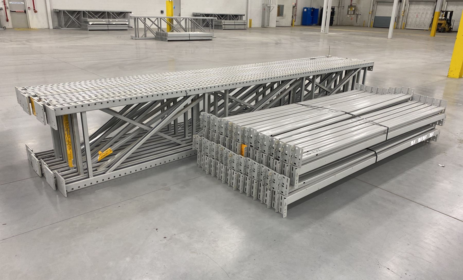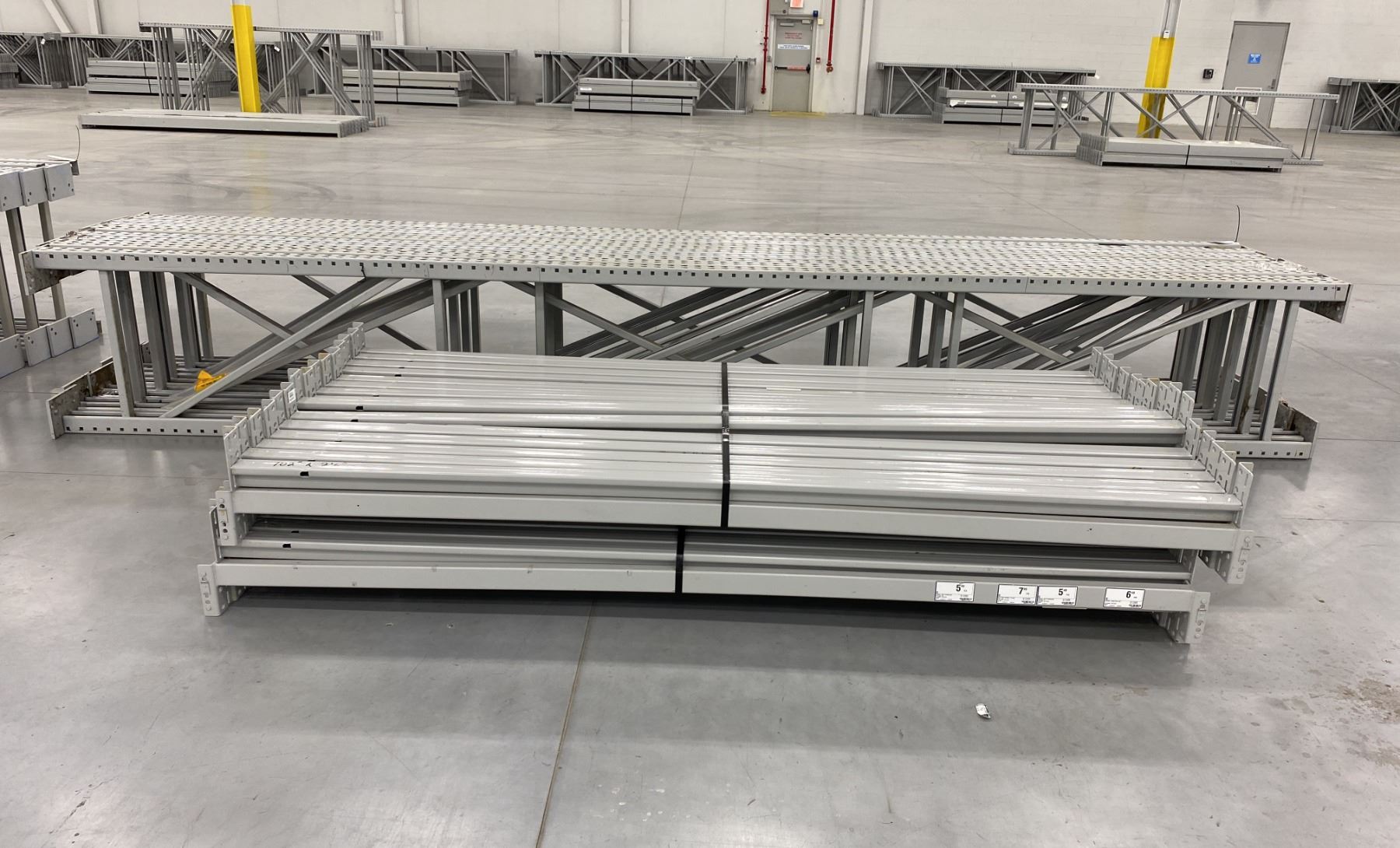 10 BAYS GREY INDUSTRIAL PALLET RACKING (11) UPRIGHTS 192" X 28" AND (60) SIDE BEAMS 102" X 2.5", WITH 8" X 6" WELDED FOOTPLATES 1/2" THICK