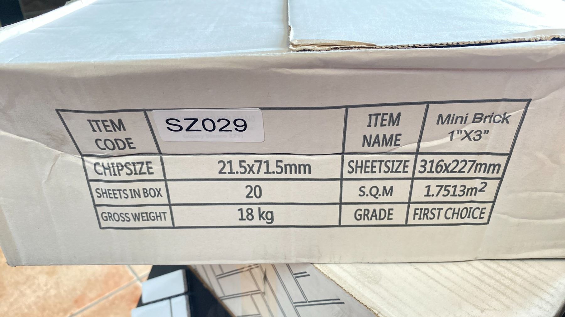 10 BOXES OF MOSAIC TILE IN HER13WG 20 X 1SQ.FT. SHEETS PER BOX APPROX 200SQ.FT. TOTAL