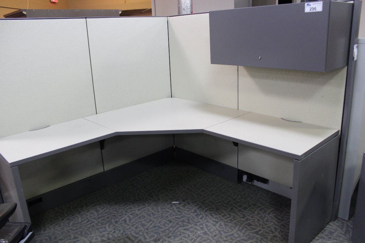 10 HAWORTH PREMISE BEIGE AND GREY CORNER WORKSTATIONS COME WITH OVERHEAD STORAGE
