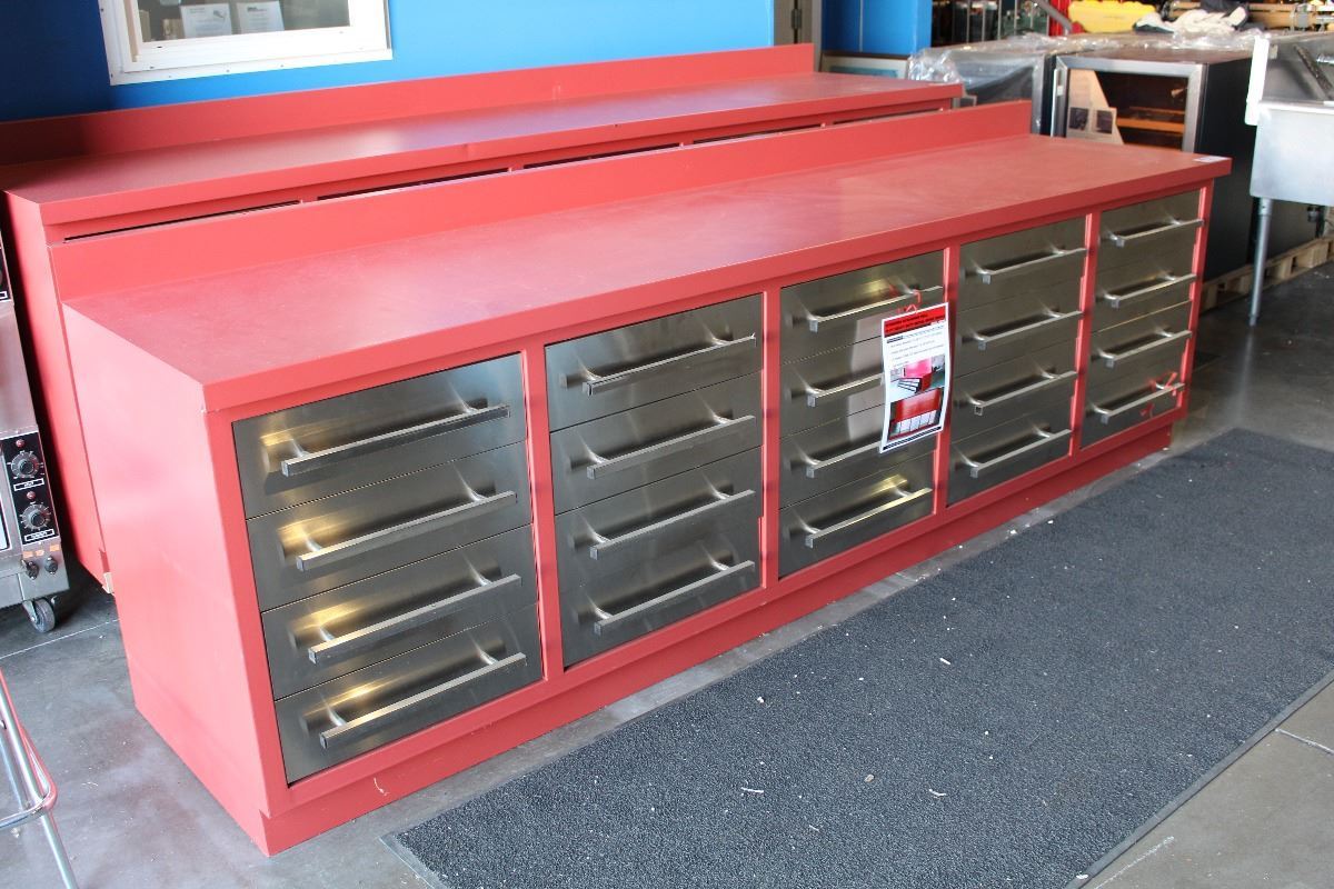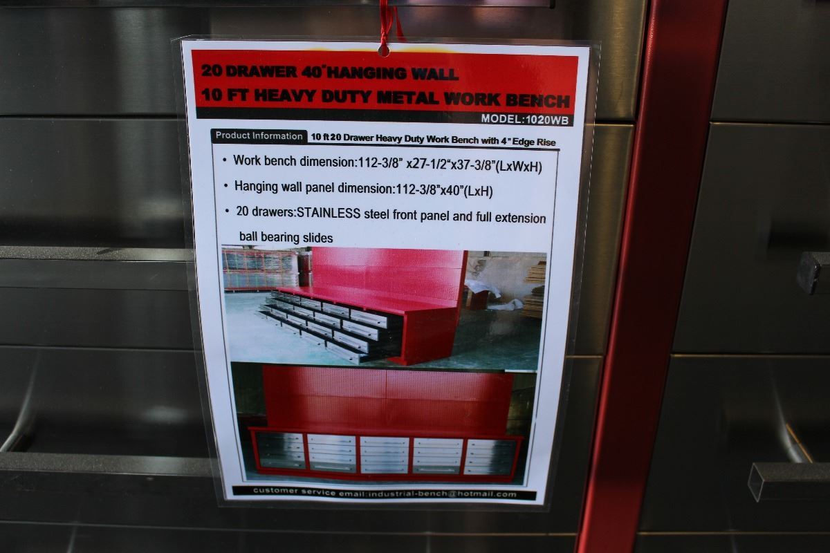 10' HEAVY DUTY METAL WORK BENCH WITH 20 DRAWERS AND 40" HANGING WALL BACK SPLASH