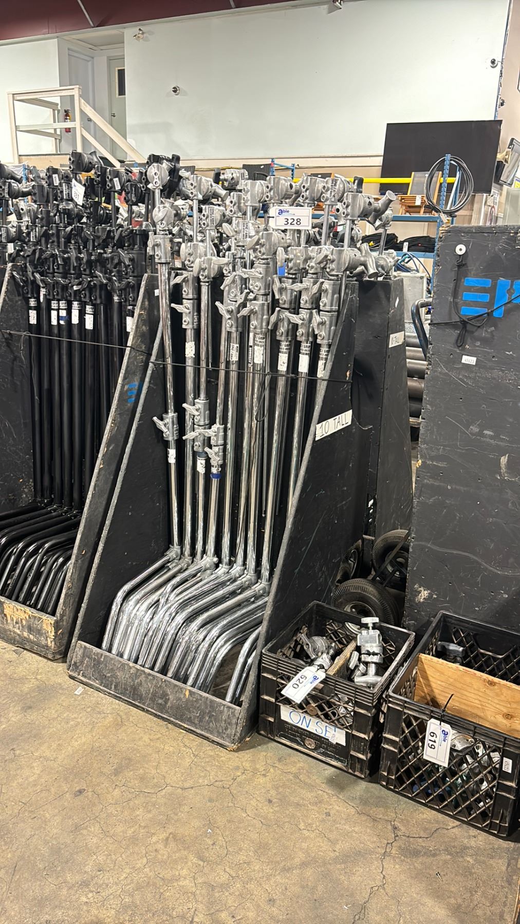 10 KUPO / AVENGER TALL C-STANDS WITH LONG ARMS IN PNEUMATIC TIRE TRANSPORT CART