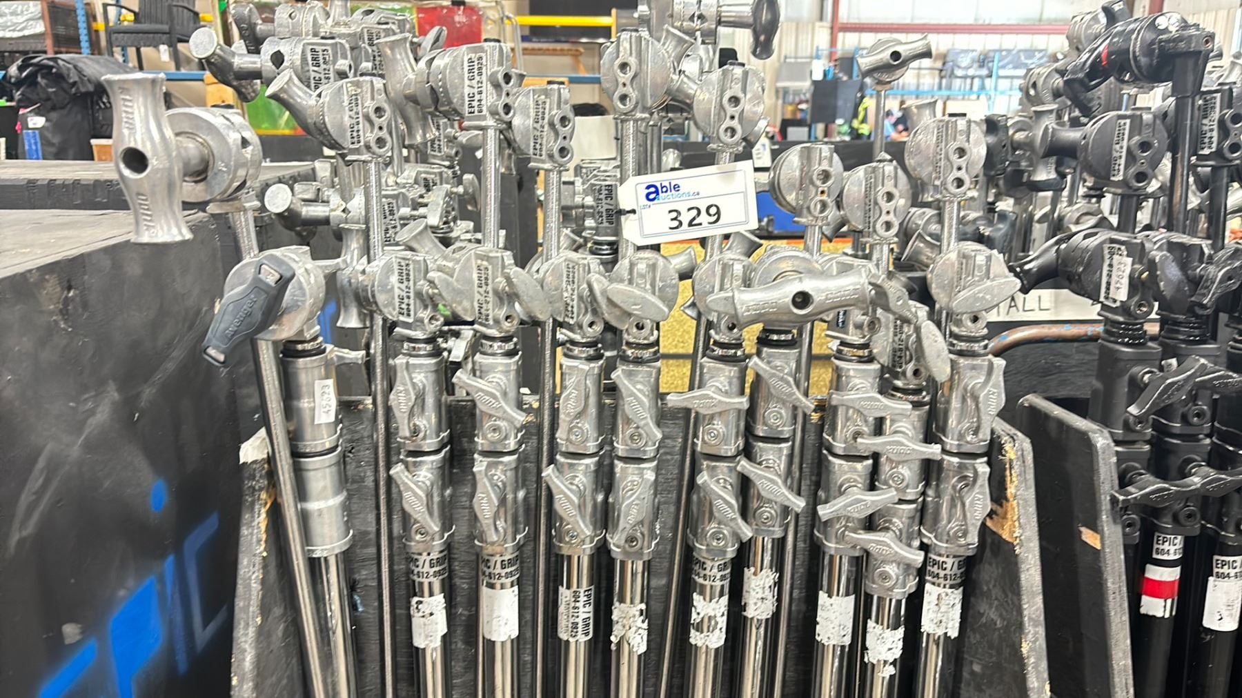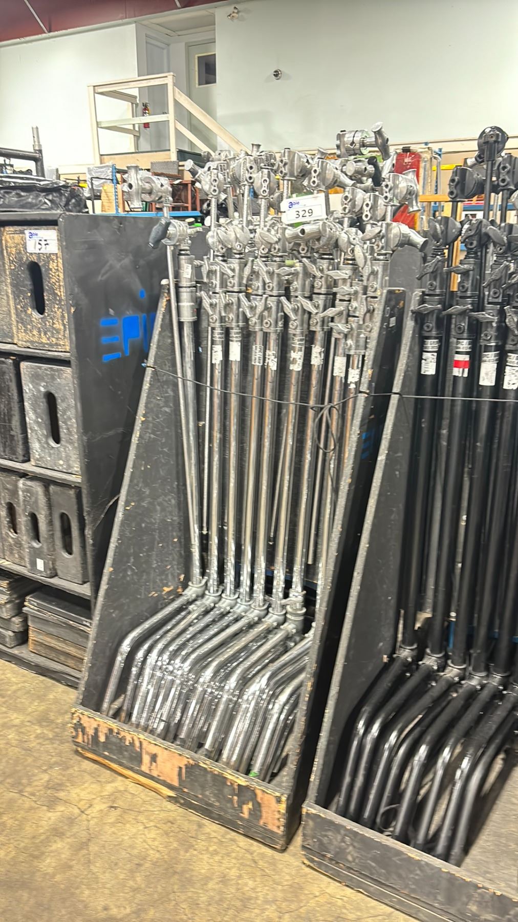 10 KUPO / AVENGER TALL C-STANDS WITH LONG ARMS IN PNEUMATIC TIRE TRANSPORT CART