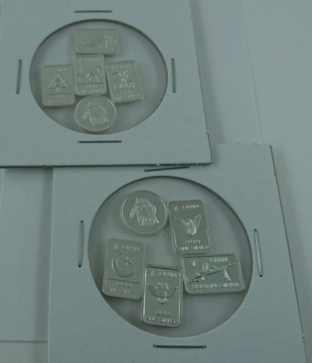 10 X .999 FINE SILVER ART BARS + ROUNDS. VARIOUS MOTIFS. TAX EXEMPT