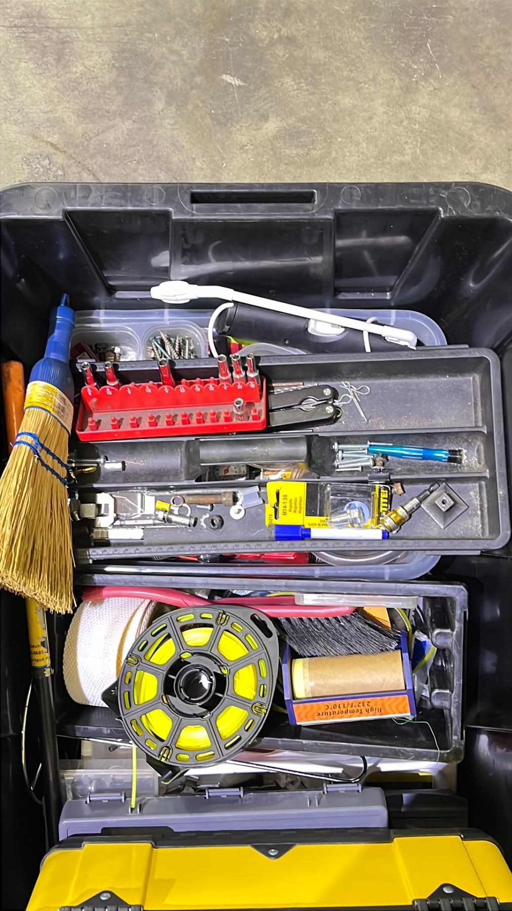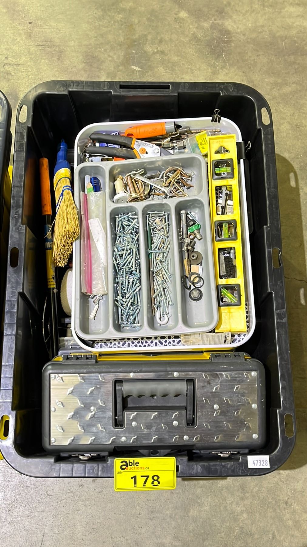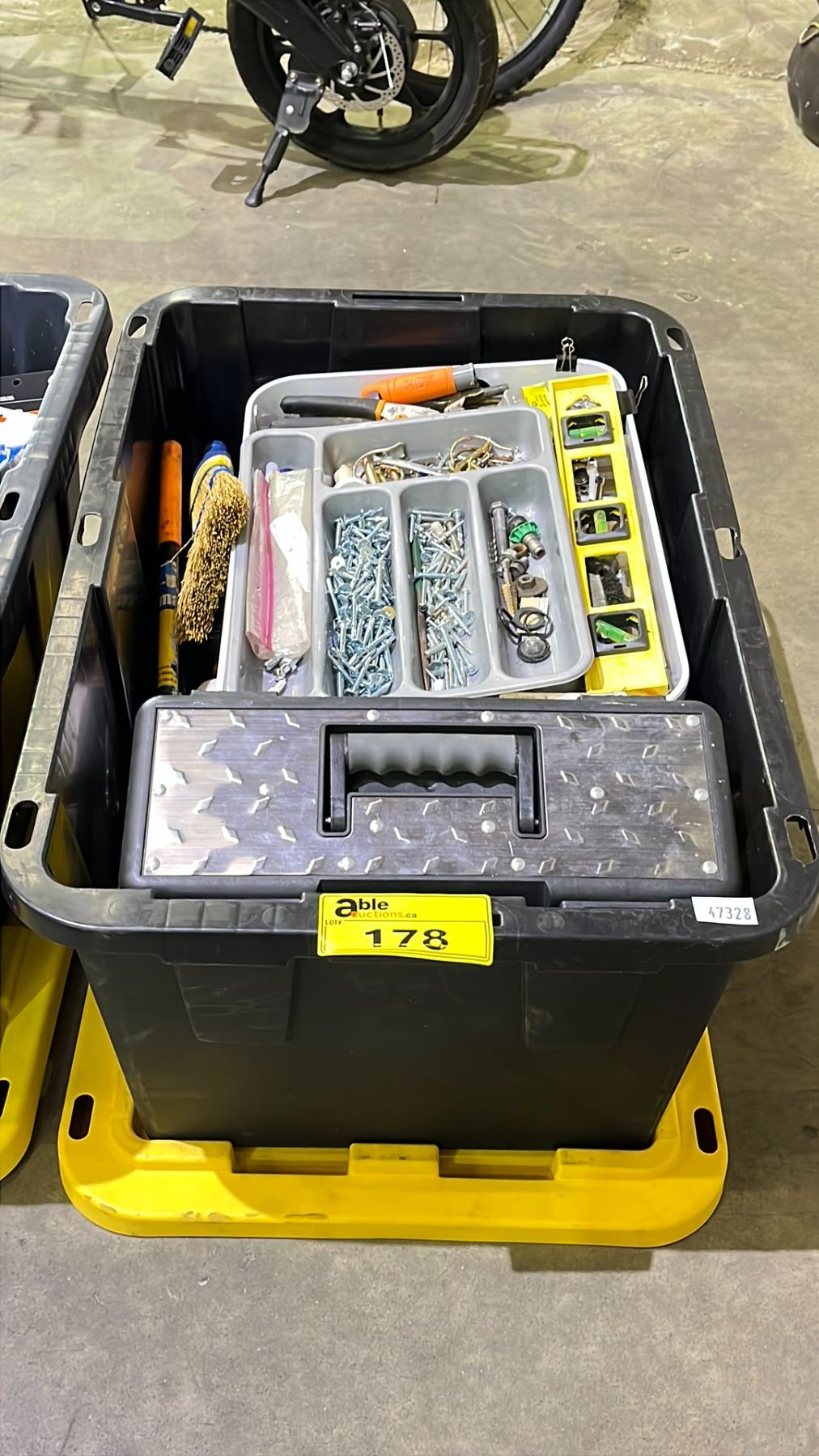 102 LITRE STORAGE BIN WITH LID FILLED WITH SMALL TOOL BOXES, HARDWARE, LEVEL, ORGANIZERS & MORE *BIN INCLUDED*