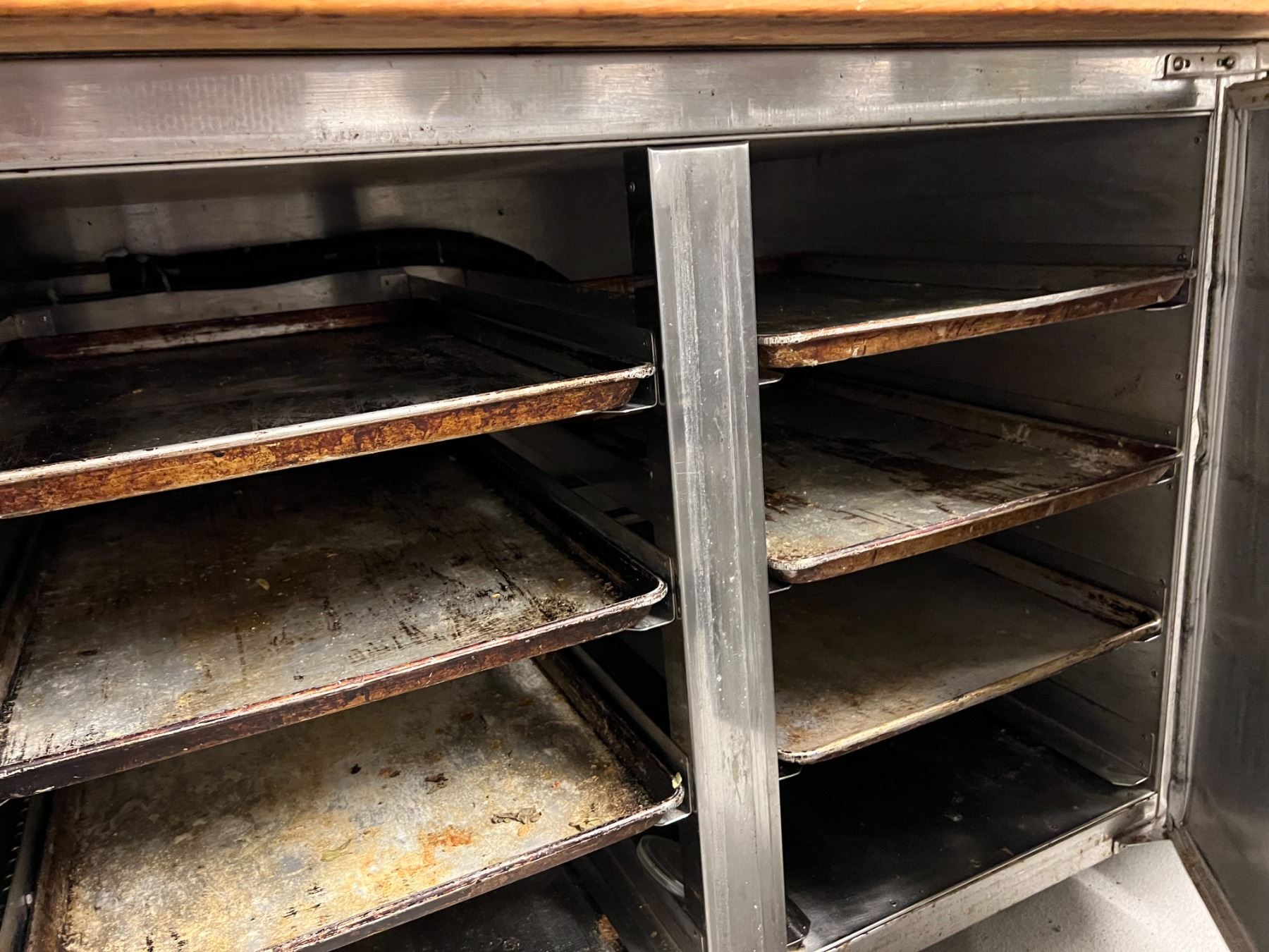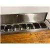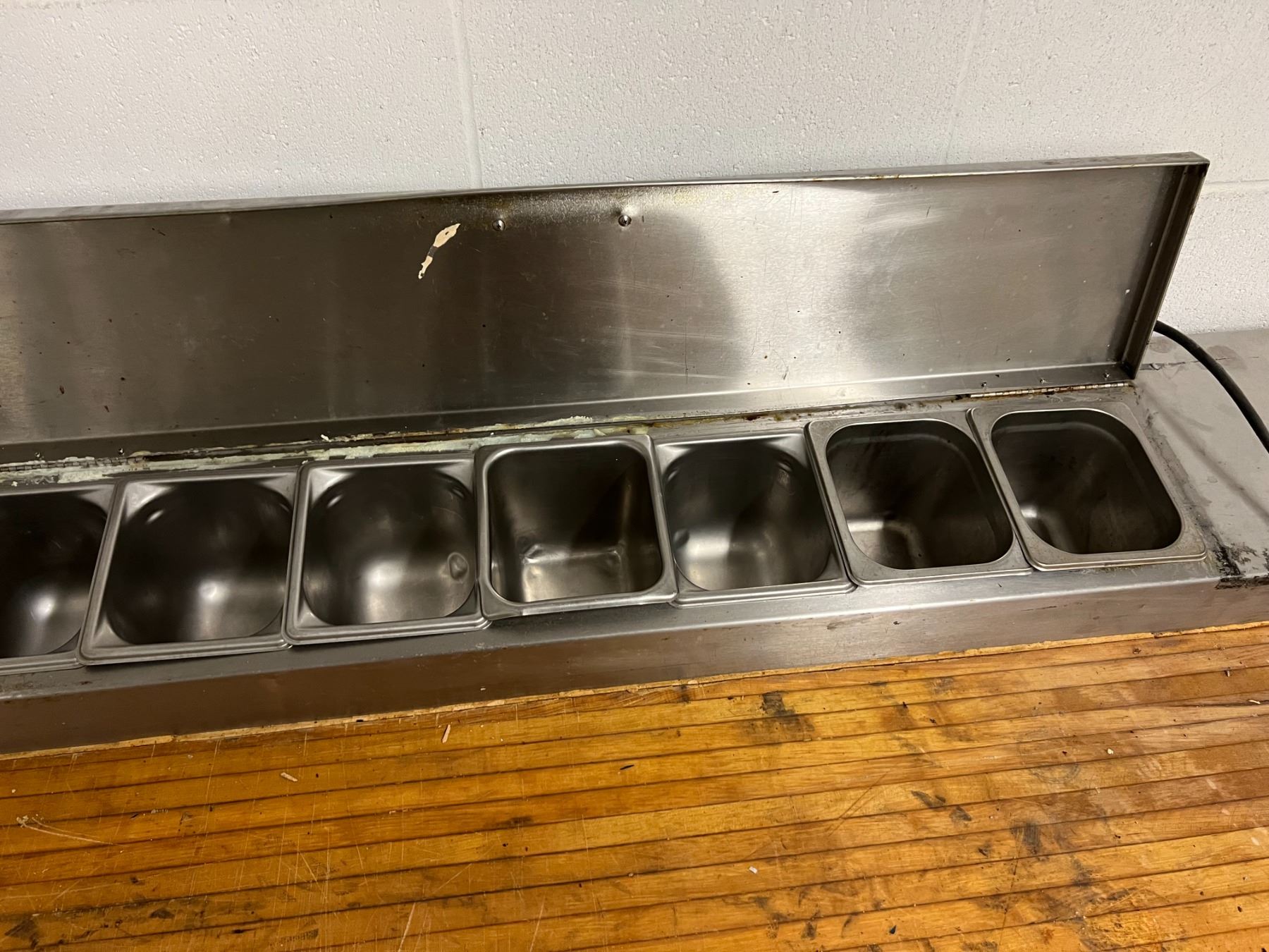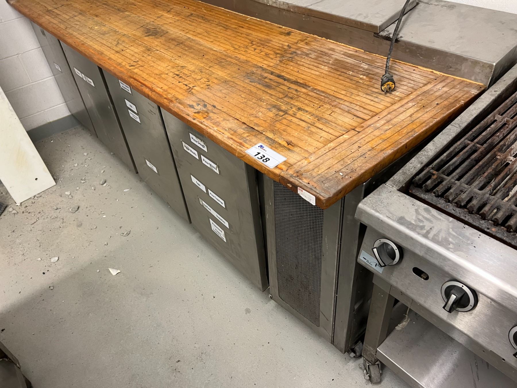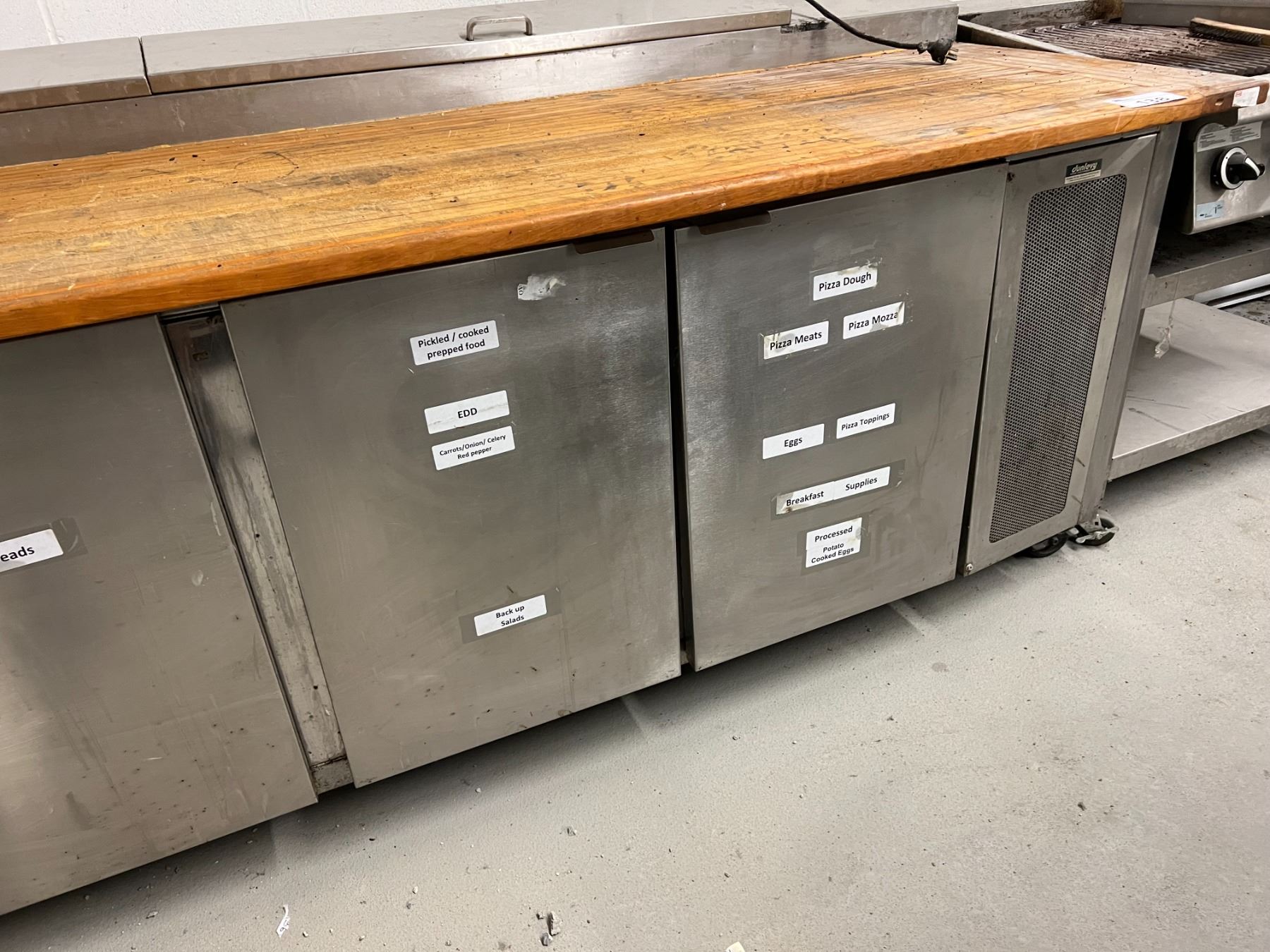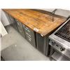 102" STAINLESS FRIDGE/PREP TABLE WITH BUTCHER BLOCK TOP. CHILLED UPPER CONDIMENT TRAY. 110 VOLT. 4 DOOR