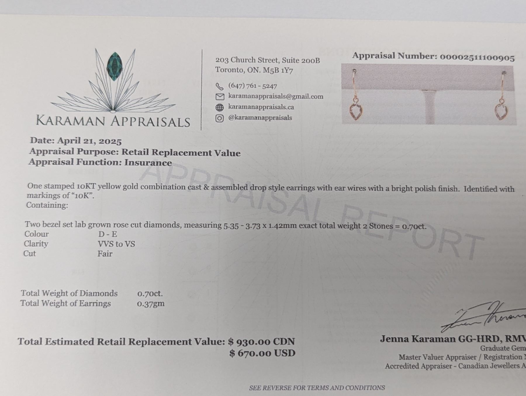 10K(0.37G), (ROSE CUT LAB DIAMOND) (0.7CT)EARRING, APPRAISED INSURANCE VALUE $930