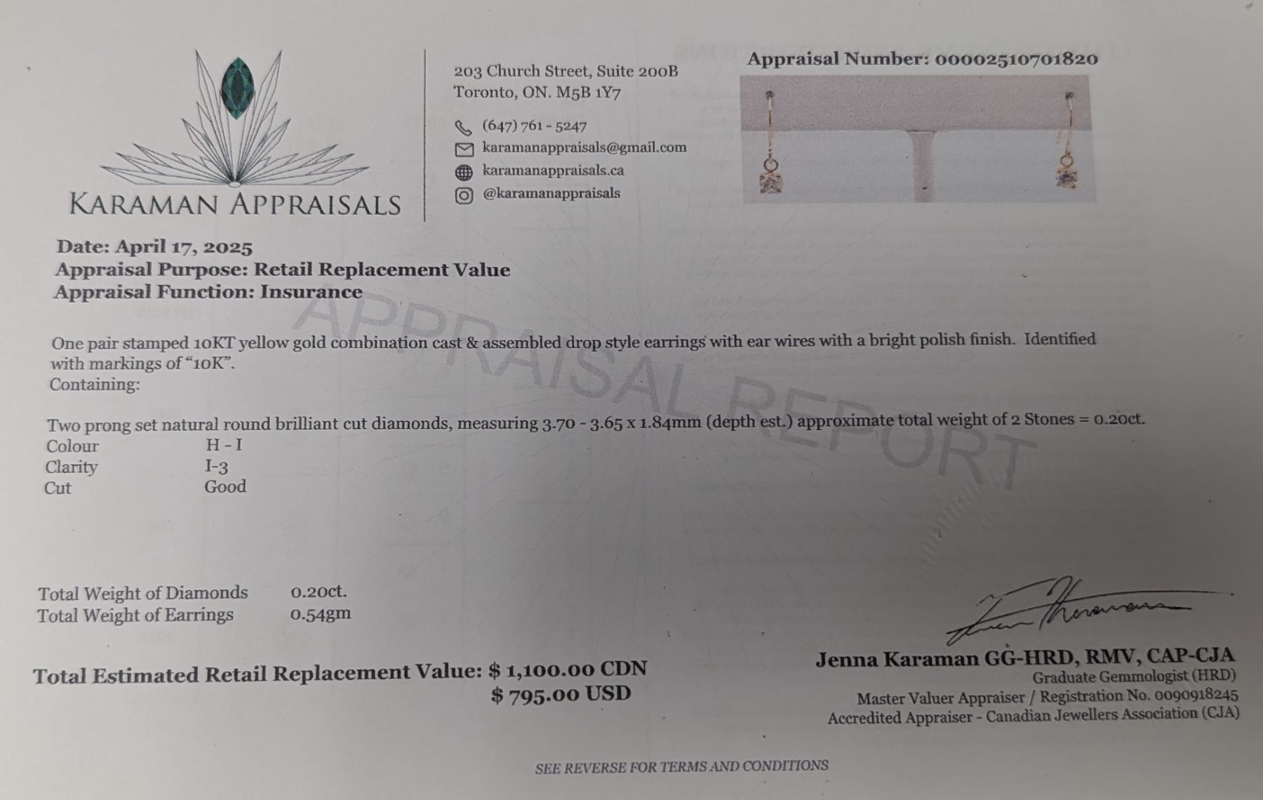 10K(0.54G), (NATURAL DIAMOND ) (0.2CT)EARRINGS, APPRAISED INSURANCE VALUE $1100
