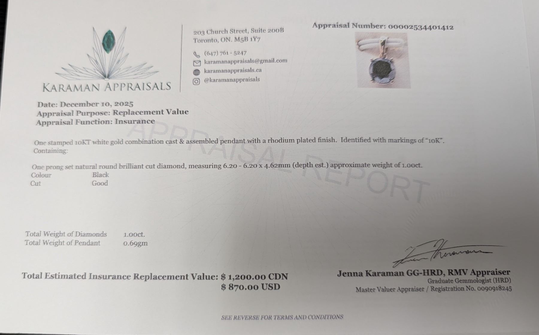 10K(0.69G), BLACK DIAMOND (1CT) SOLITAIRE PENDANT, APPRAISED INSURANCE VALUE $1200