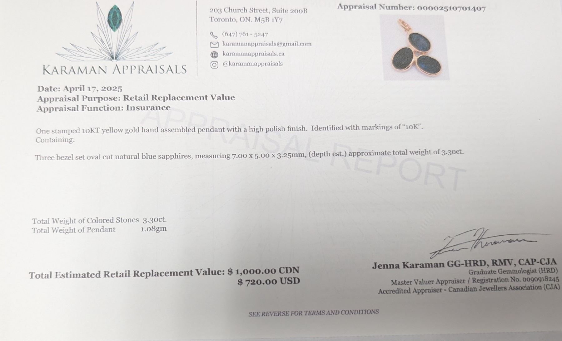 10K(1.08G), (BLUE SAPPHIRE 3.3CT)PENDANT, APPRAISED INSURANCE VALUE $1000
