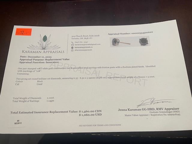 10K(1.14G), BLACK DIAMOND (2CT) EARRING, APPRAISED INSURANCE VALUE $1460