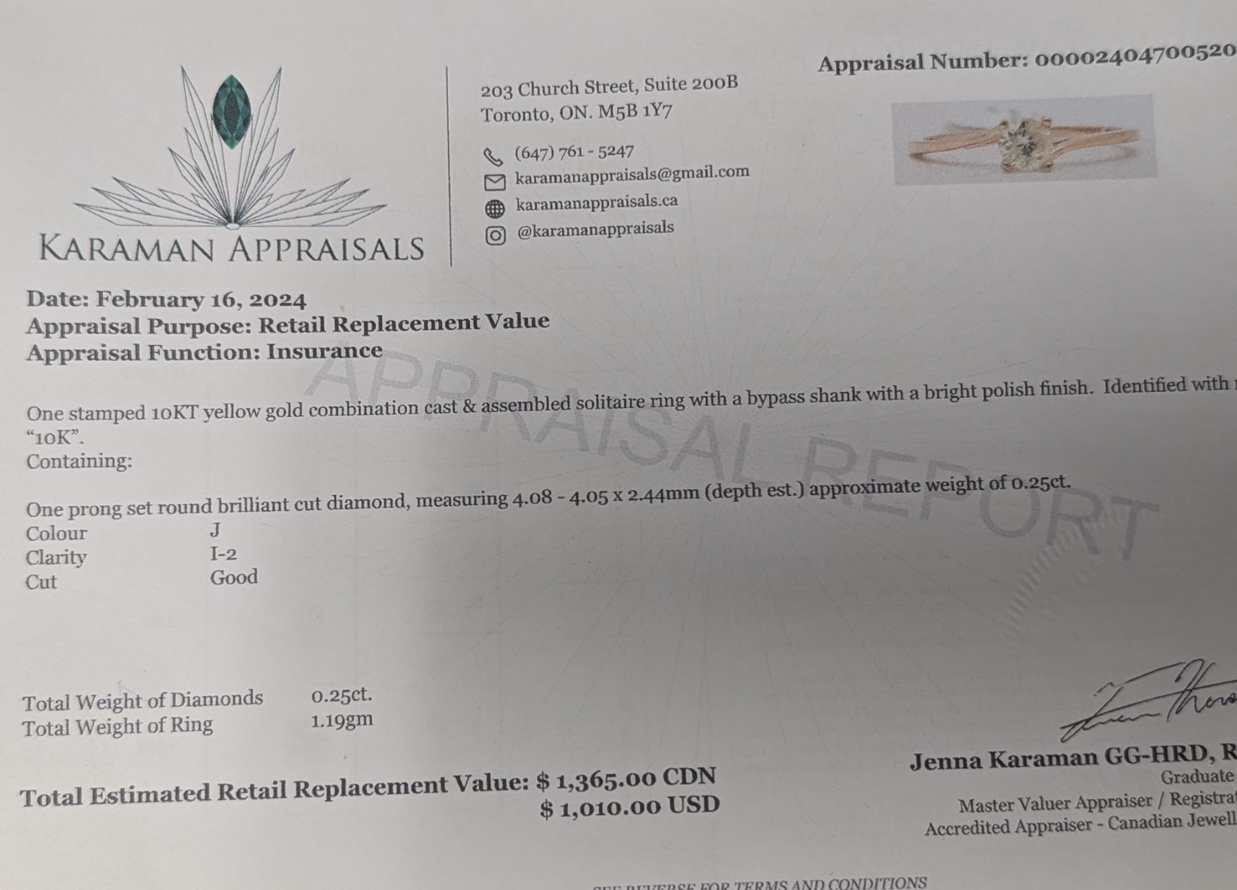 10K (1.19G) NATURAL DIAMOND (0.25CT) RING (SIZE 6.5) APPRAISED INSURANCE VALUE $1365