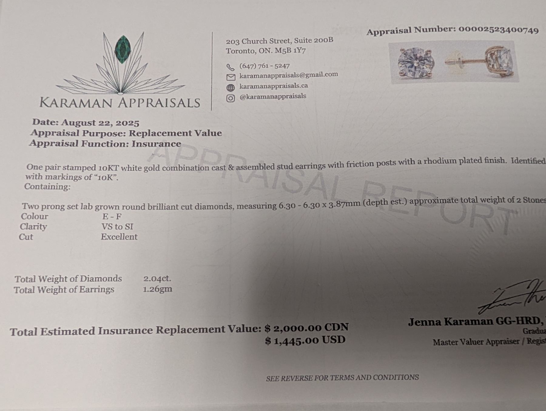 10K(1.26G), LAB DIAMOND (2.04CT) EARRING, APPRAISED INSURANCE VALUE $2000