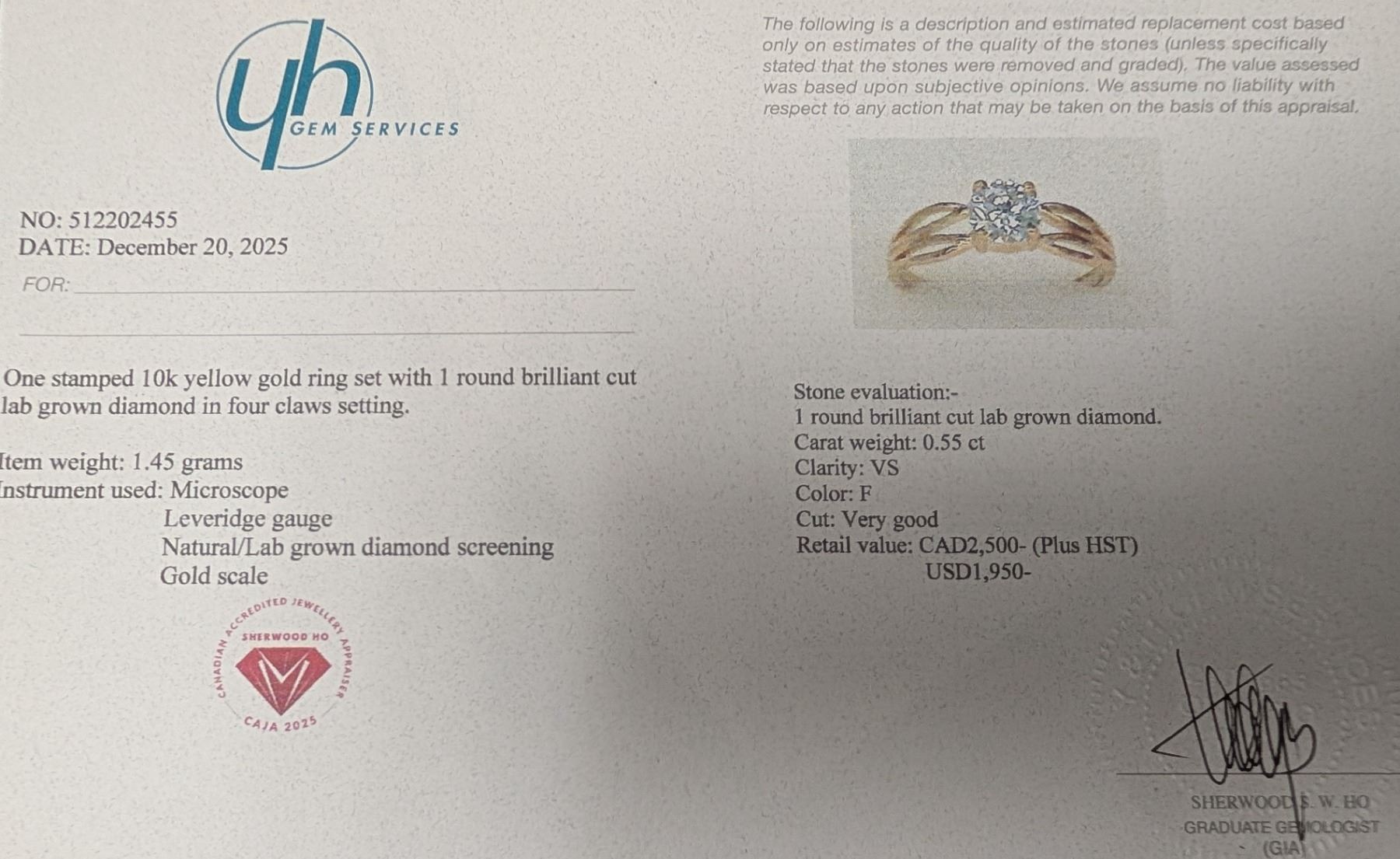 10K(1.45G), LAB DIAMOND (0.55CT)RING, SIZE 5, APPRAISED INSURANCE VALUE $2500