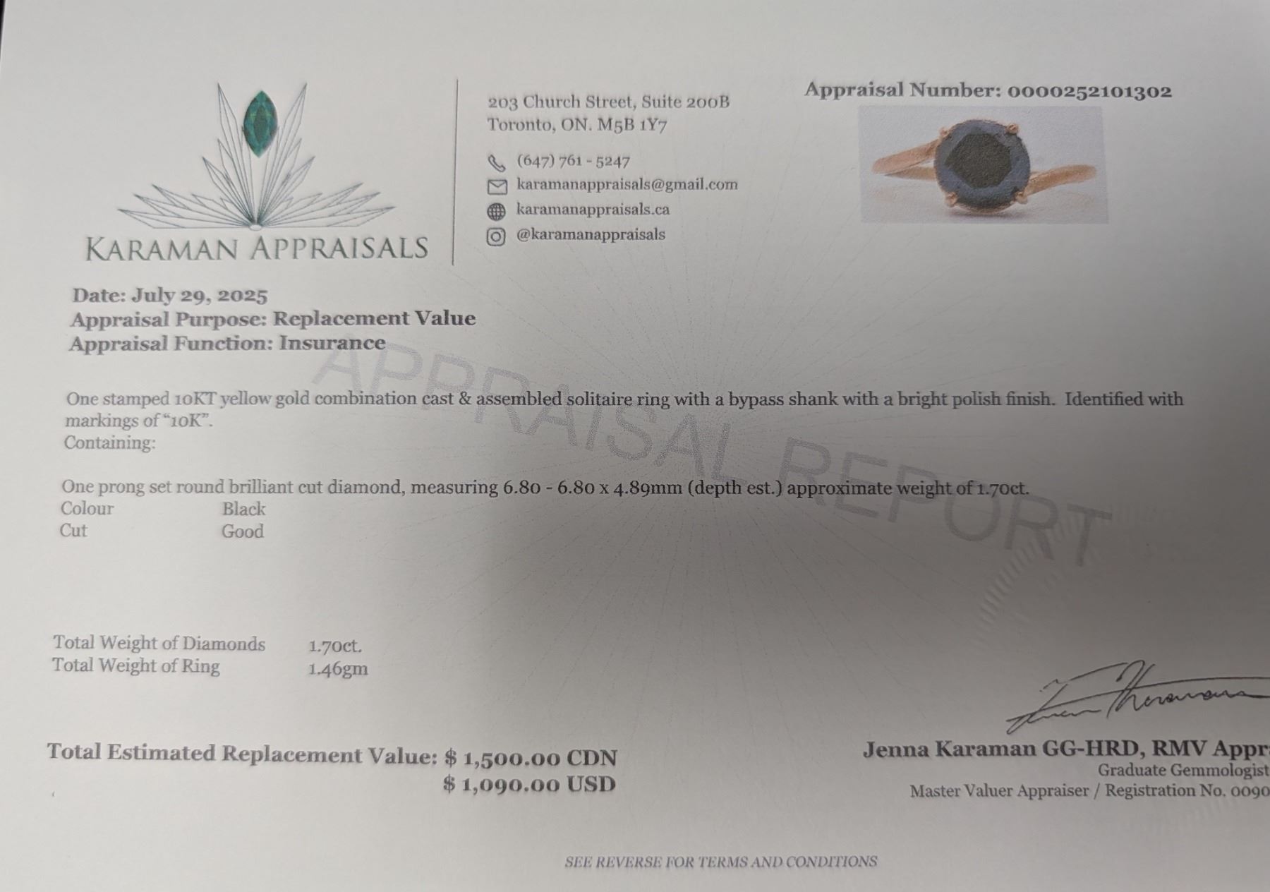 10K(1.46G), BLACK DIAMOND (1.7CT)RING, SIZE 6.25, APPRAISED INSURANCE VALUE $1500