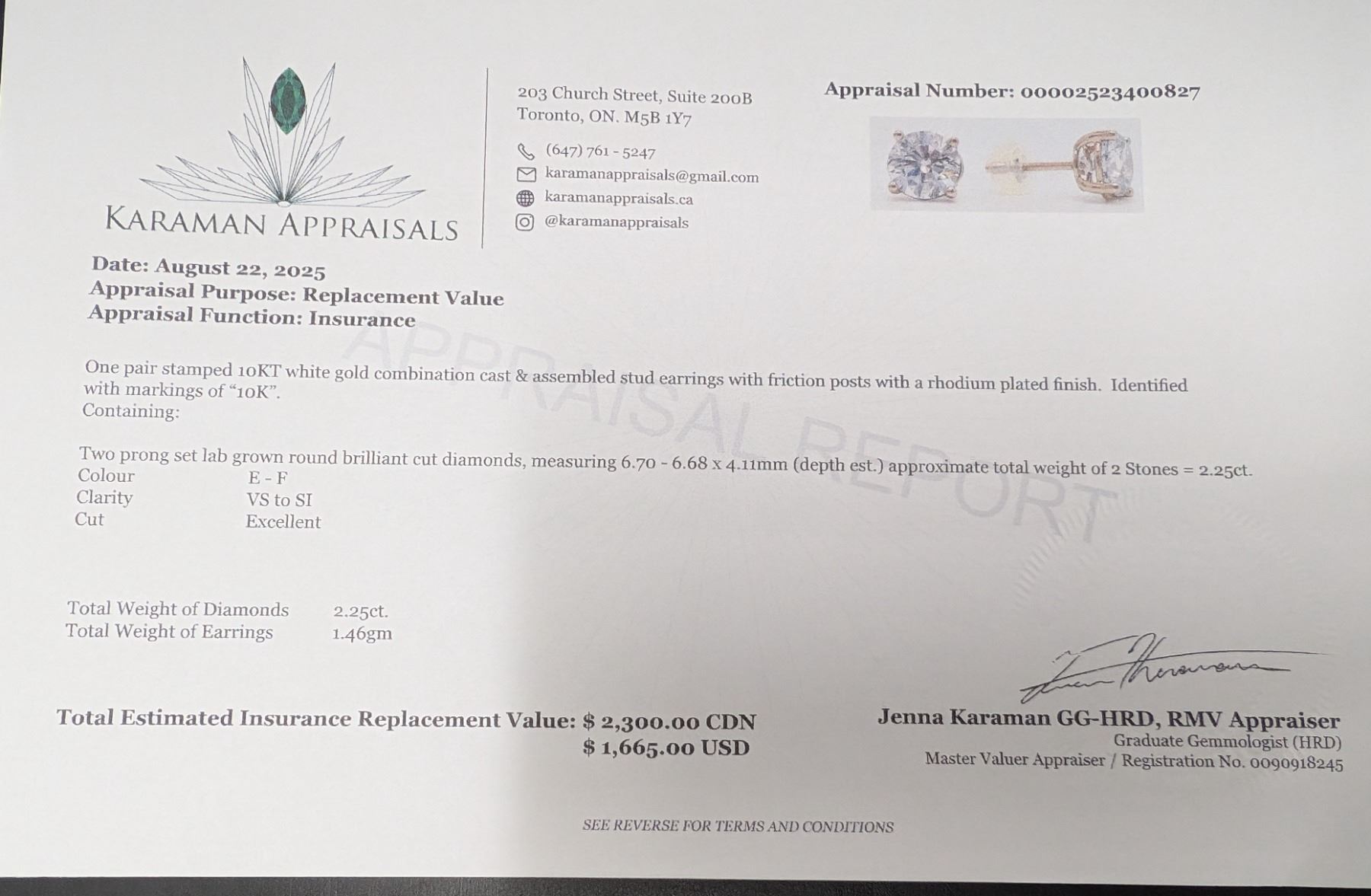 10K (1.46G) LAB DIAMOND (2.25CT) EARRINGS APPRAISED INSURANCE VALUE $2300