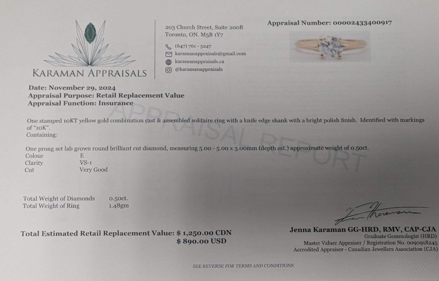 10K(1.48G), (LAB DIAMOND 0.5CT)RING, SIZE 6, APPRAISED INSURANCE VALUE $1250
