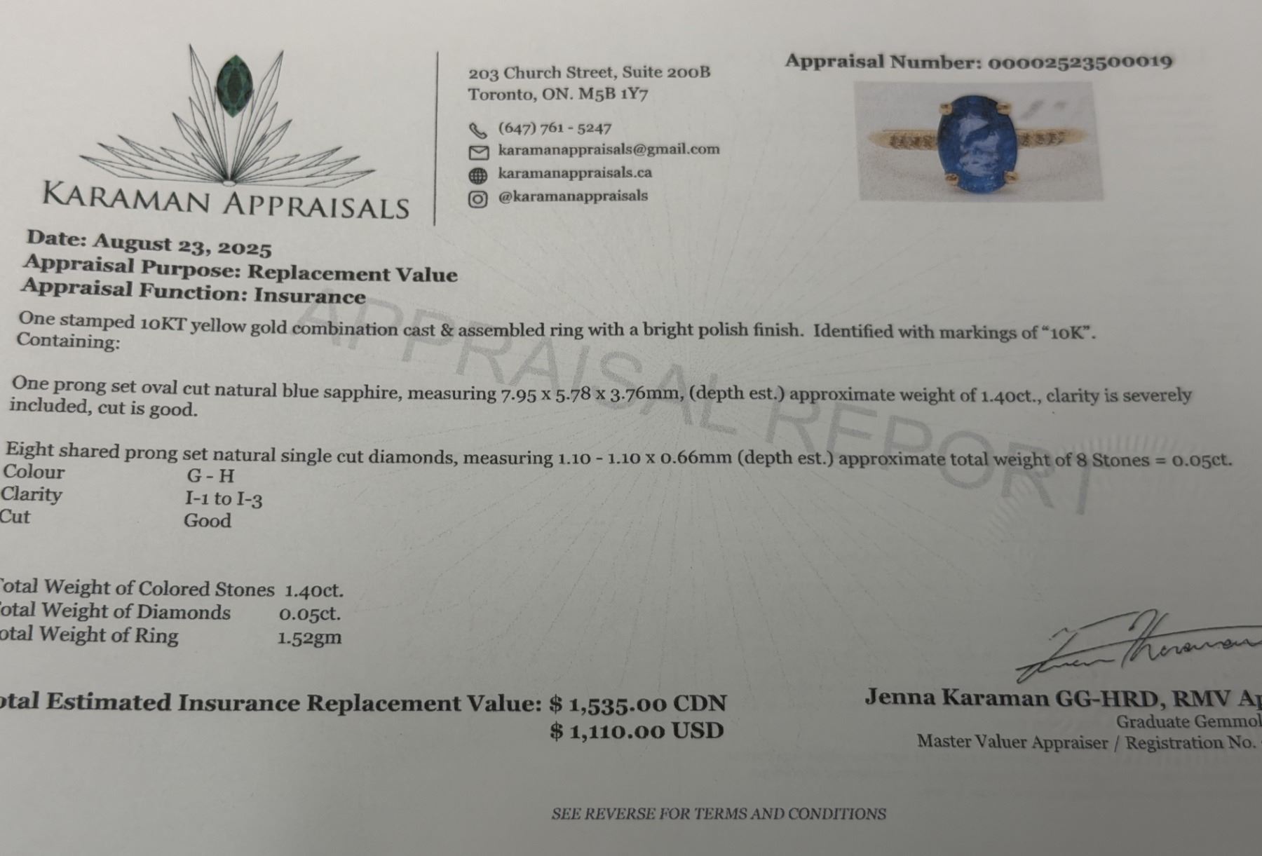 10K (1.52G) BLUE SAPPHIRE (1.4CT) DIAMOND (0.05CT) RING APPRAISED INSURANCE VALUE $1535