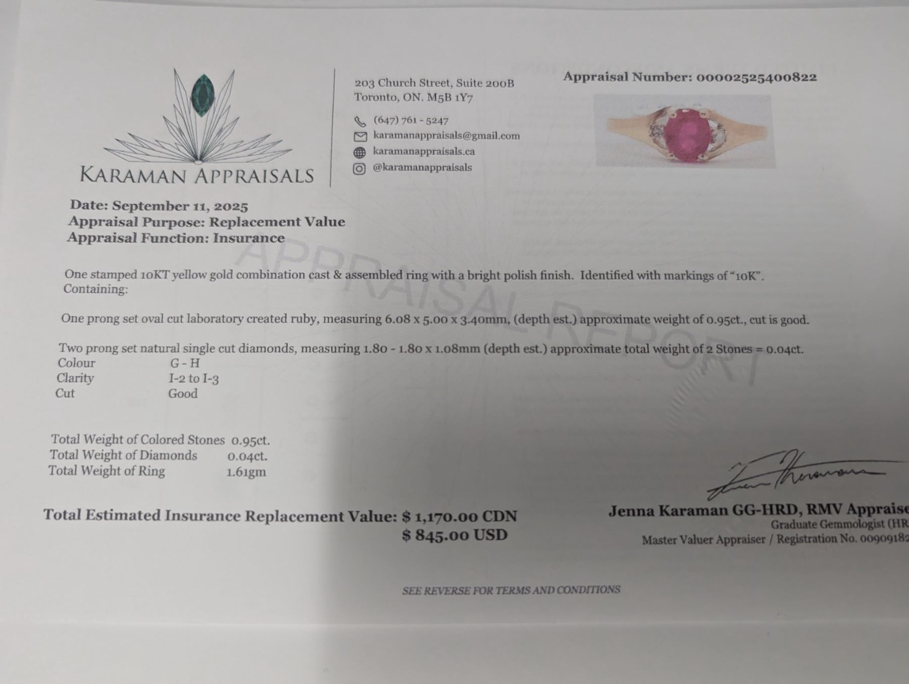 10K (1.61G) LAB RUBY (0.95CT) DIAMOND (0.04CT) RING (SIZE 7) APPRAISED INSURANCE VALUE $1170