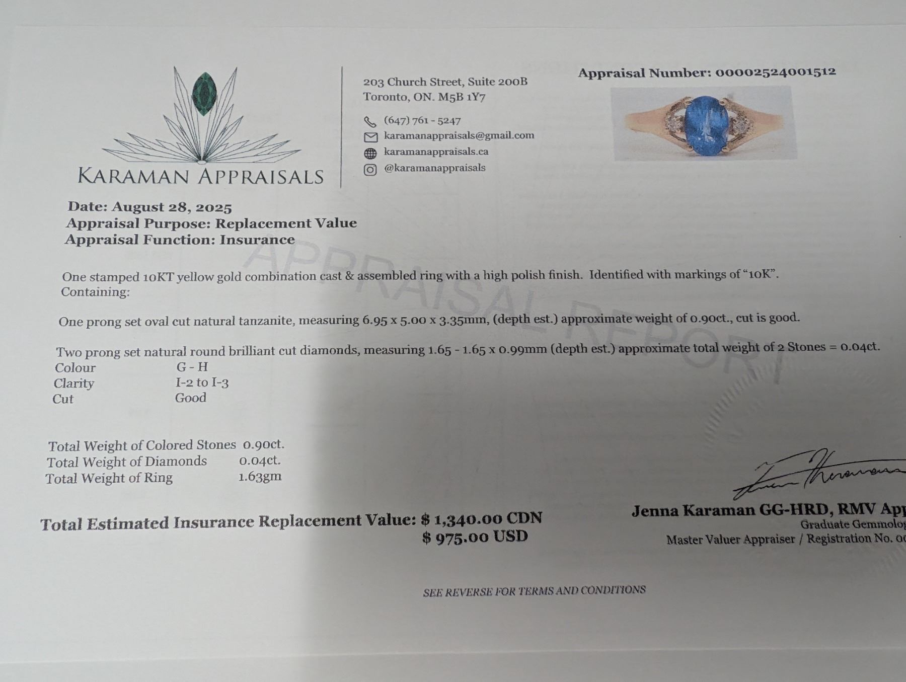 10K (1.63g) TANZANITE (0.9CT) DIAMOND (0.04CT) RING (SIZE 7) APPRAISED INSURANCE VALUE $1340
