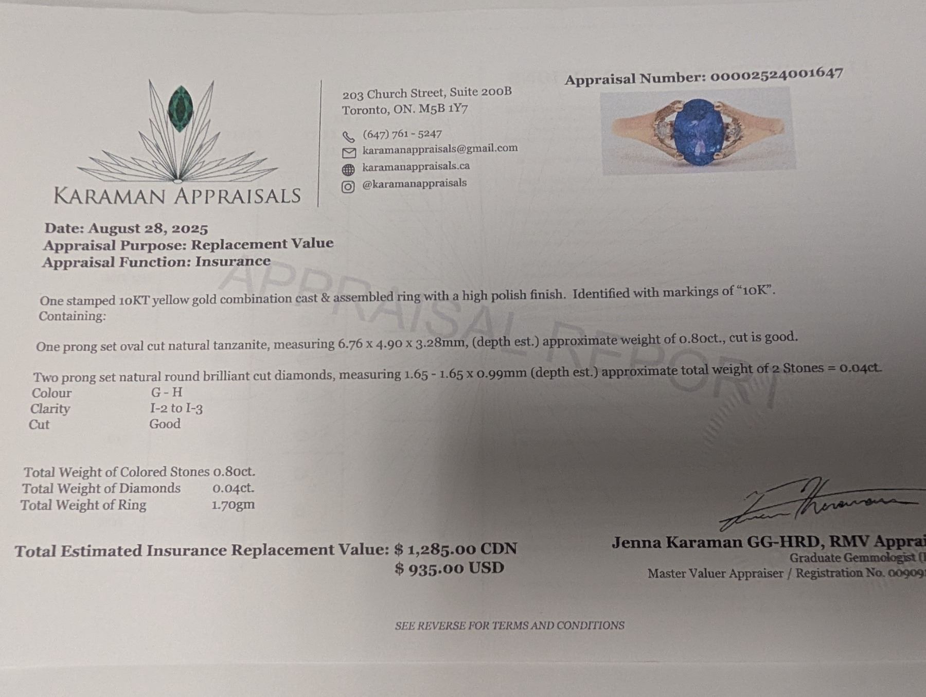 10K(1.7G), TANZANITE (0.8CT), DIA (0.04CT)RING, SIZE 7.25, APPRAISED INSURANCE VALUE $1285