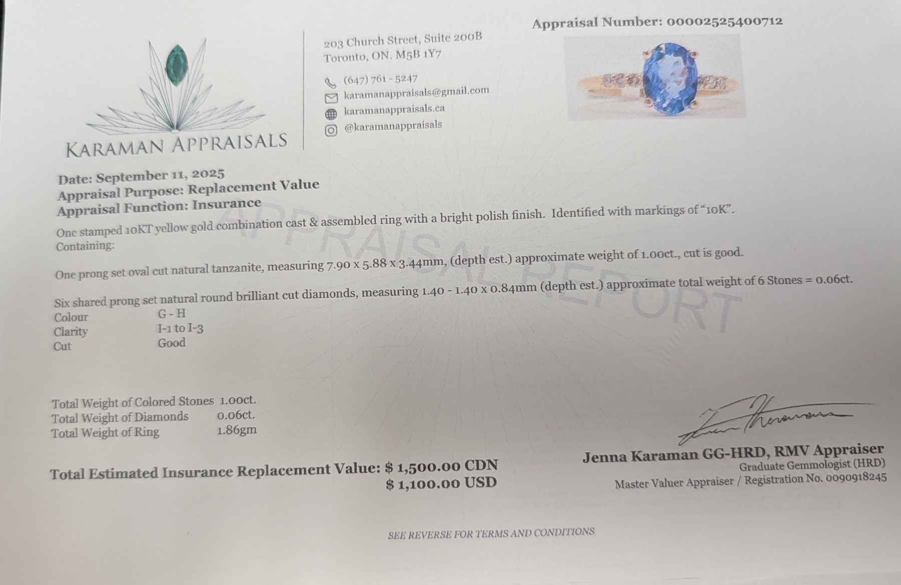 10K(1.86G), TANZANITE (1CT), DIAMOND (0.06CT)RING, SIZE 5.5, APPRAISED INSURANCE VALUE $1500