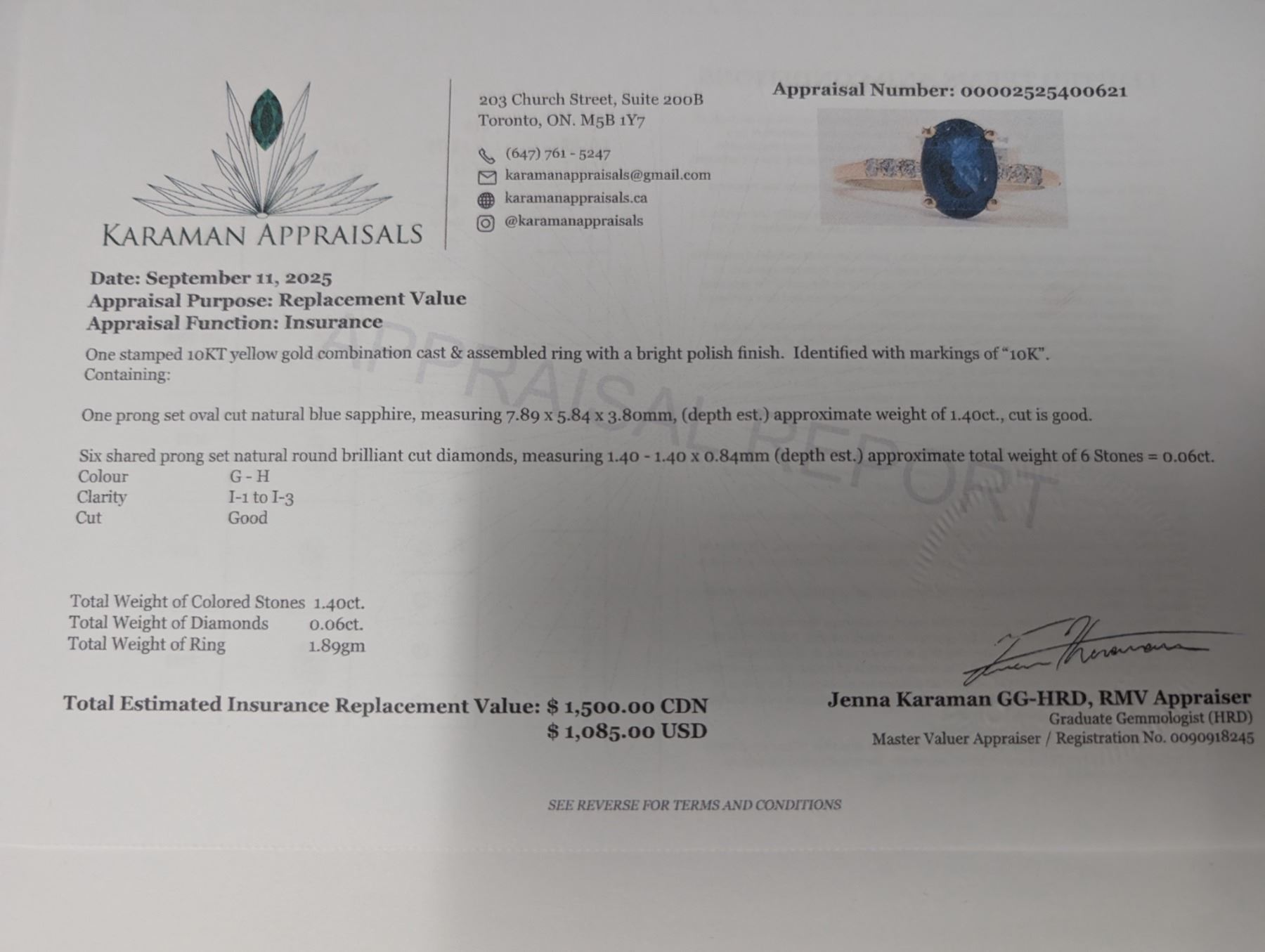 10K (1.89G) SAPPHIRE (1.4CT) DIAMOND (0.06CT) RING (SIZE 5.5) APPRAISED INSURANCE VALUE $1500