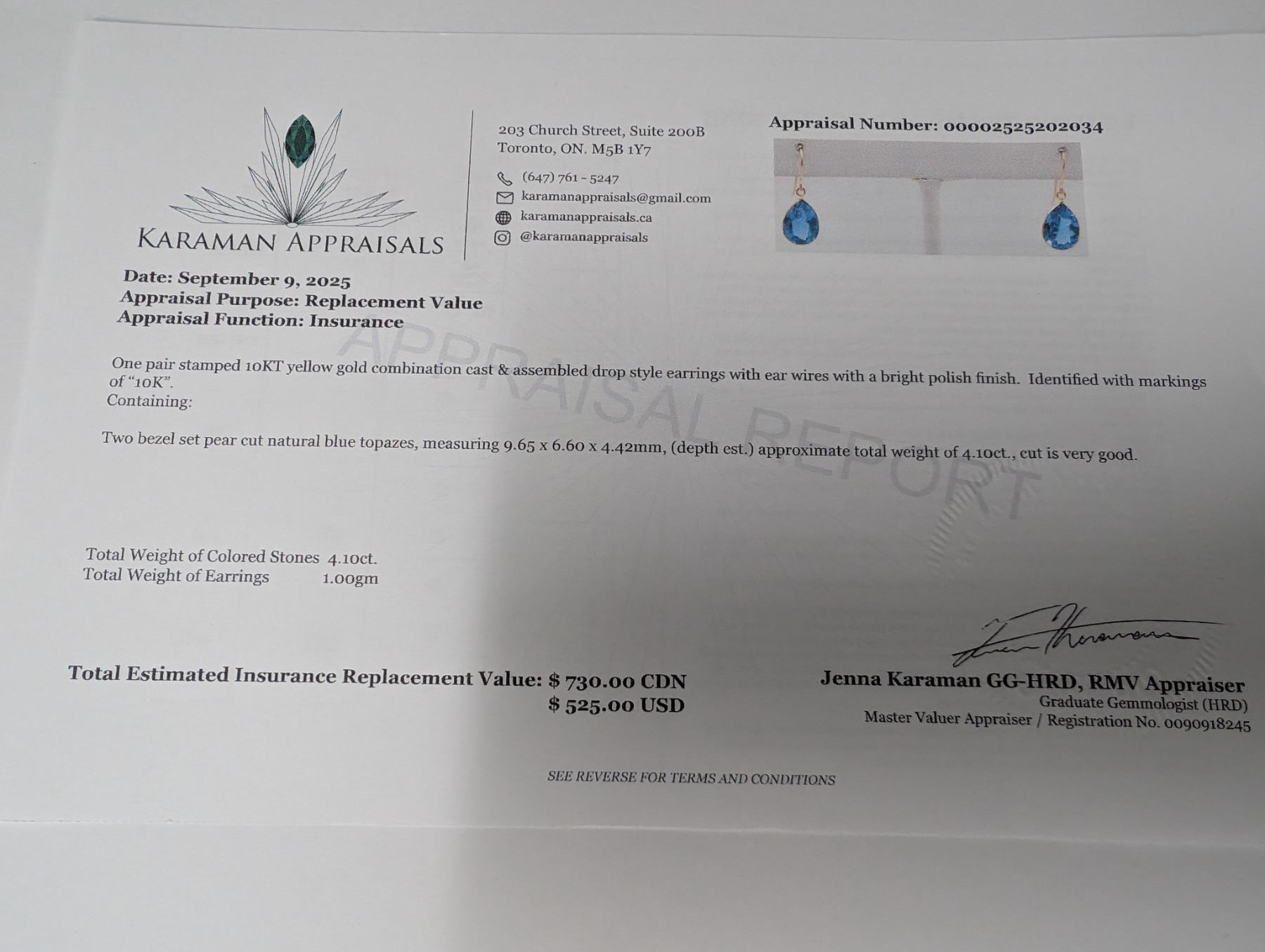10K (1G) BLUE TOPAZ (4.1CT) EARRINGS APPRAISED INSURANCE VALUE $730