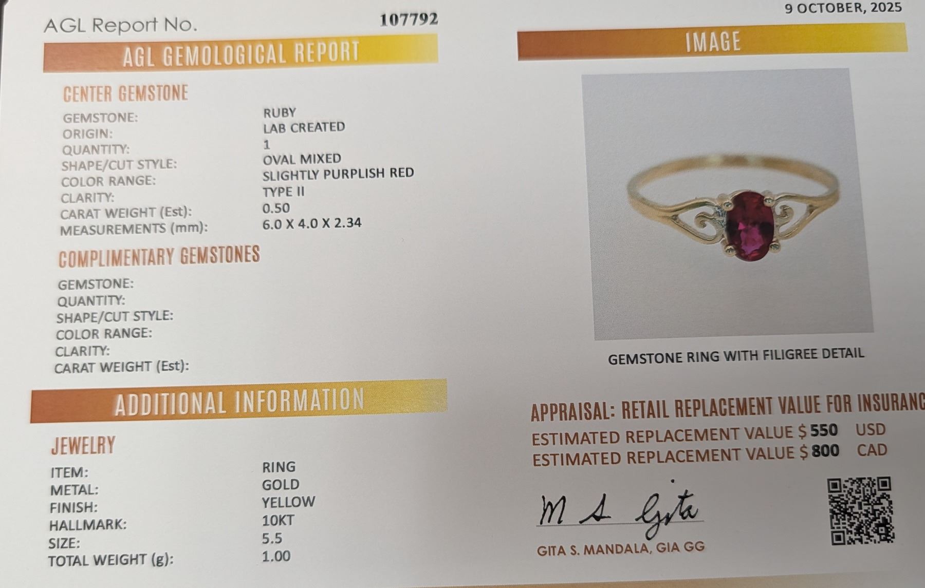 10K(1G), LAB RUBY (0.5CT)RING, SIZE 5.5, APPRAISED INSURANCE VALUE $800