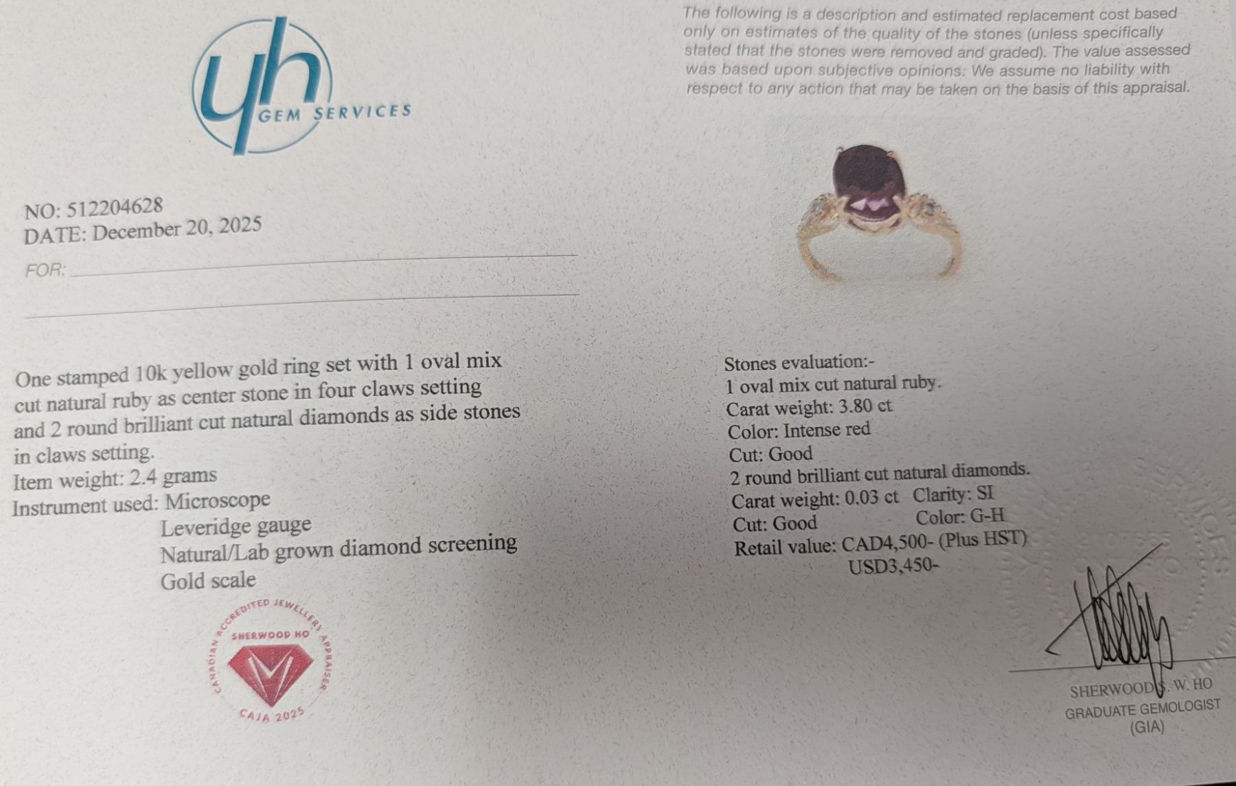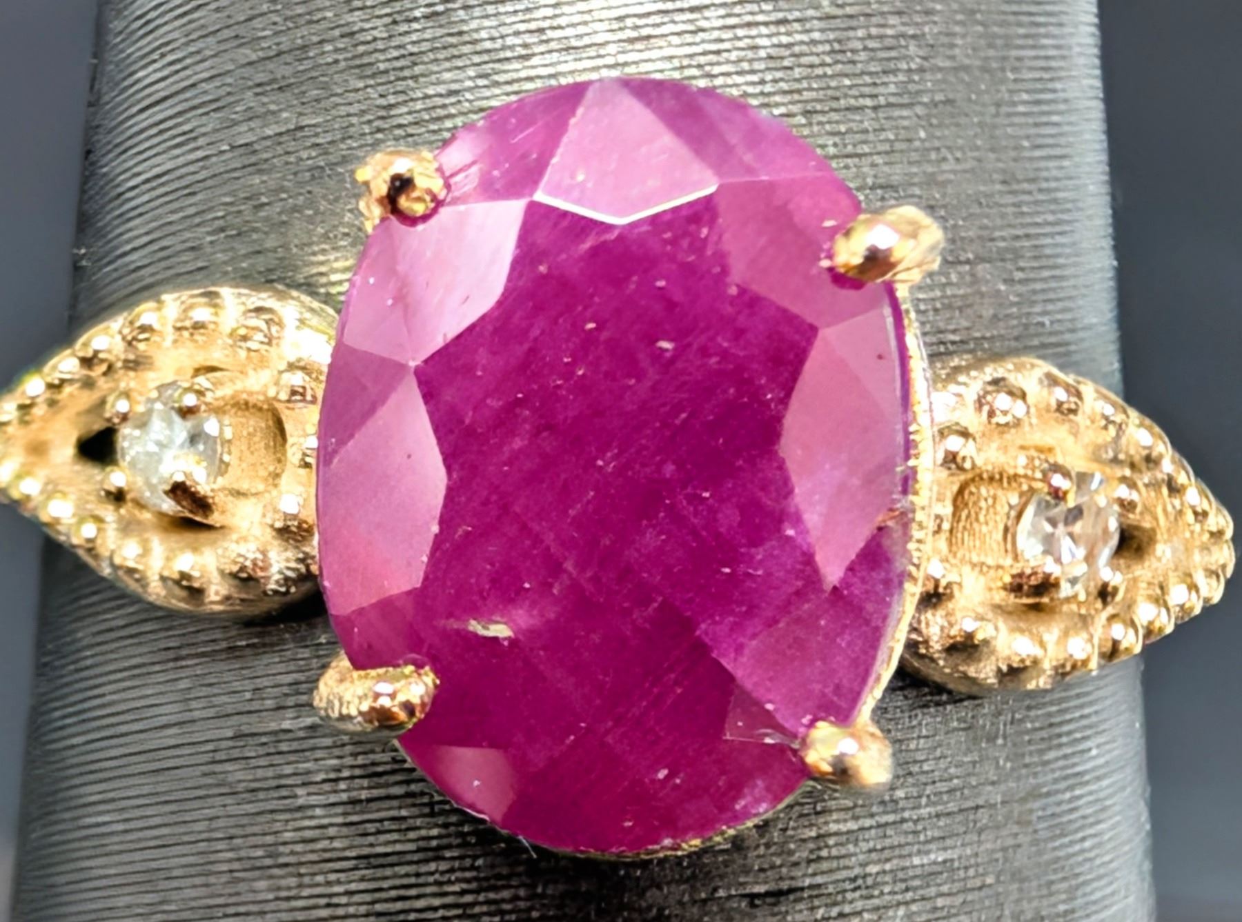 10K(2.4G), NATURAL RUBY (3.8CT), DIAMOND (0.03CT)RING, SIZE 7.5, APPRAISED INSURANCE VALUE $4500