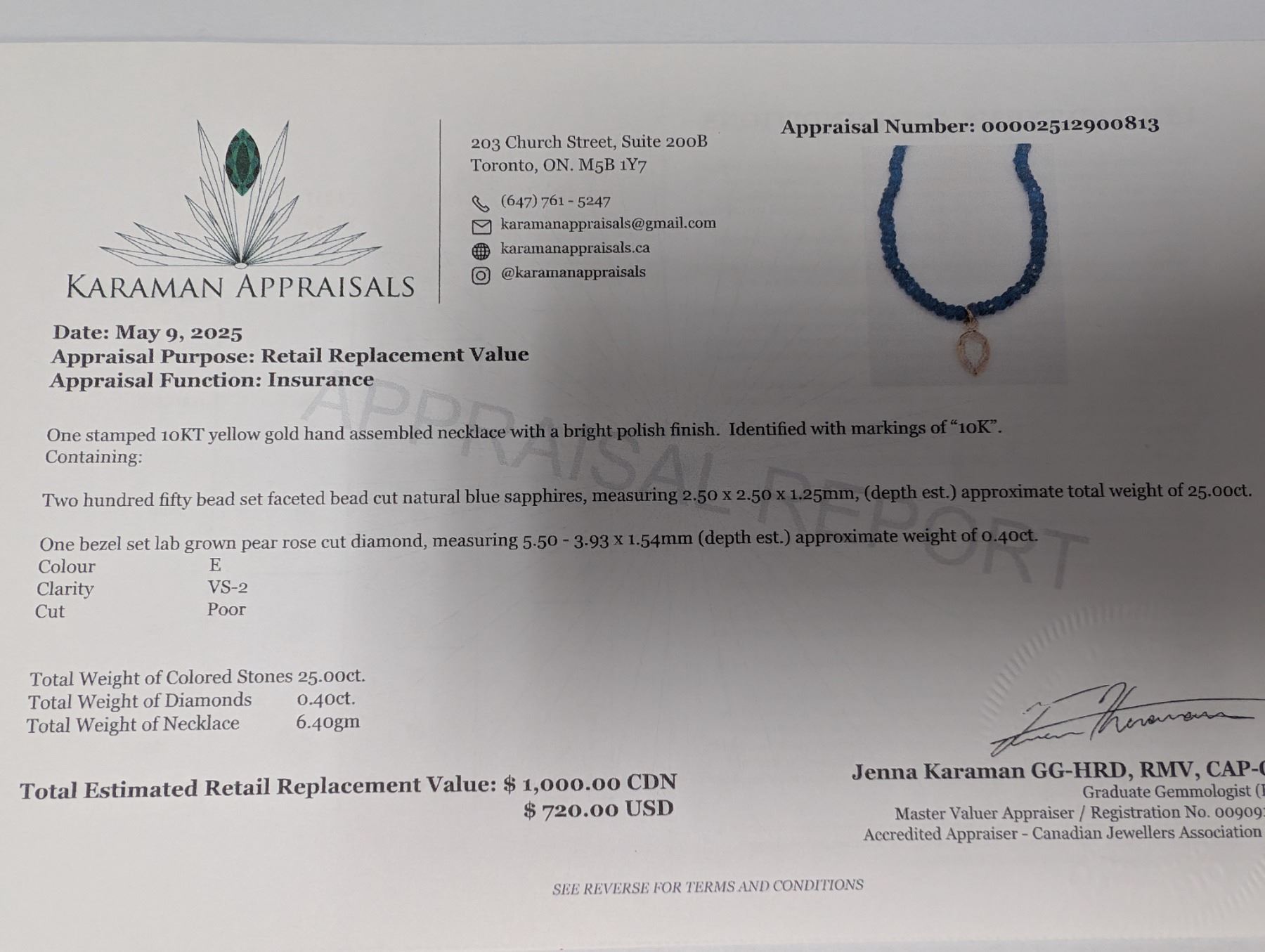 $10K(6.4G), LAB DIAMOND (0.4CT), SAPPHIRE (25CT)NECKLACE 16", APPRAISED VALUE $1000