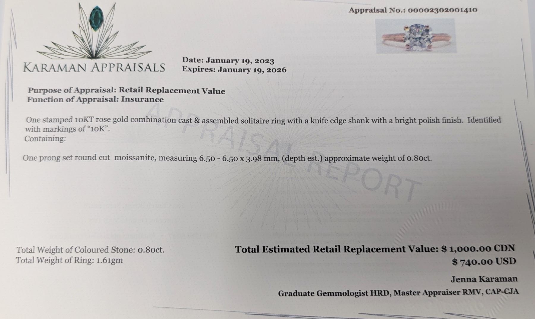 10K ROSE GOLD 1.61G MOISSANITE 0.8CT RING APPRAISED INSURANCE VALUE $1000